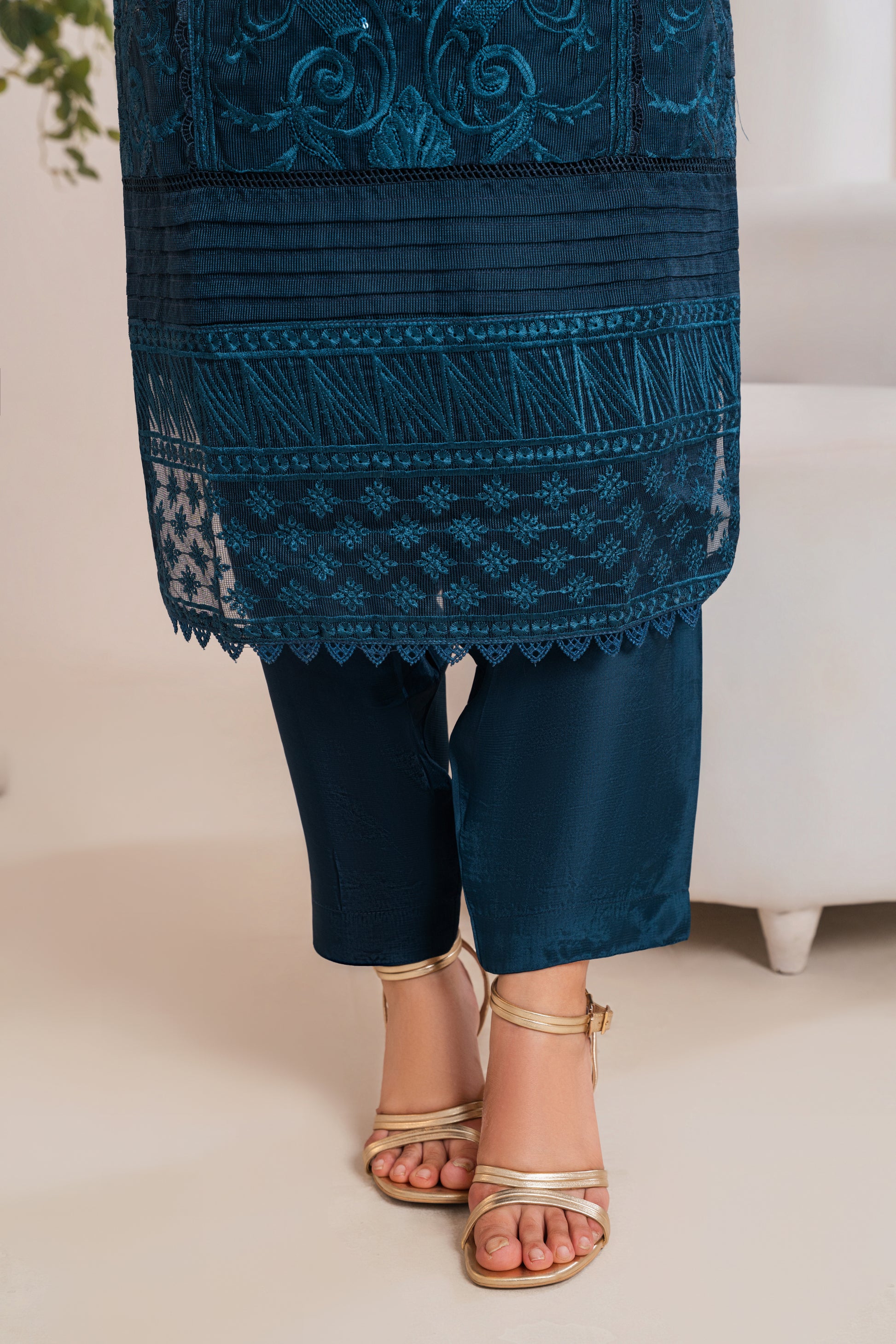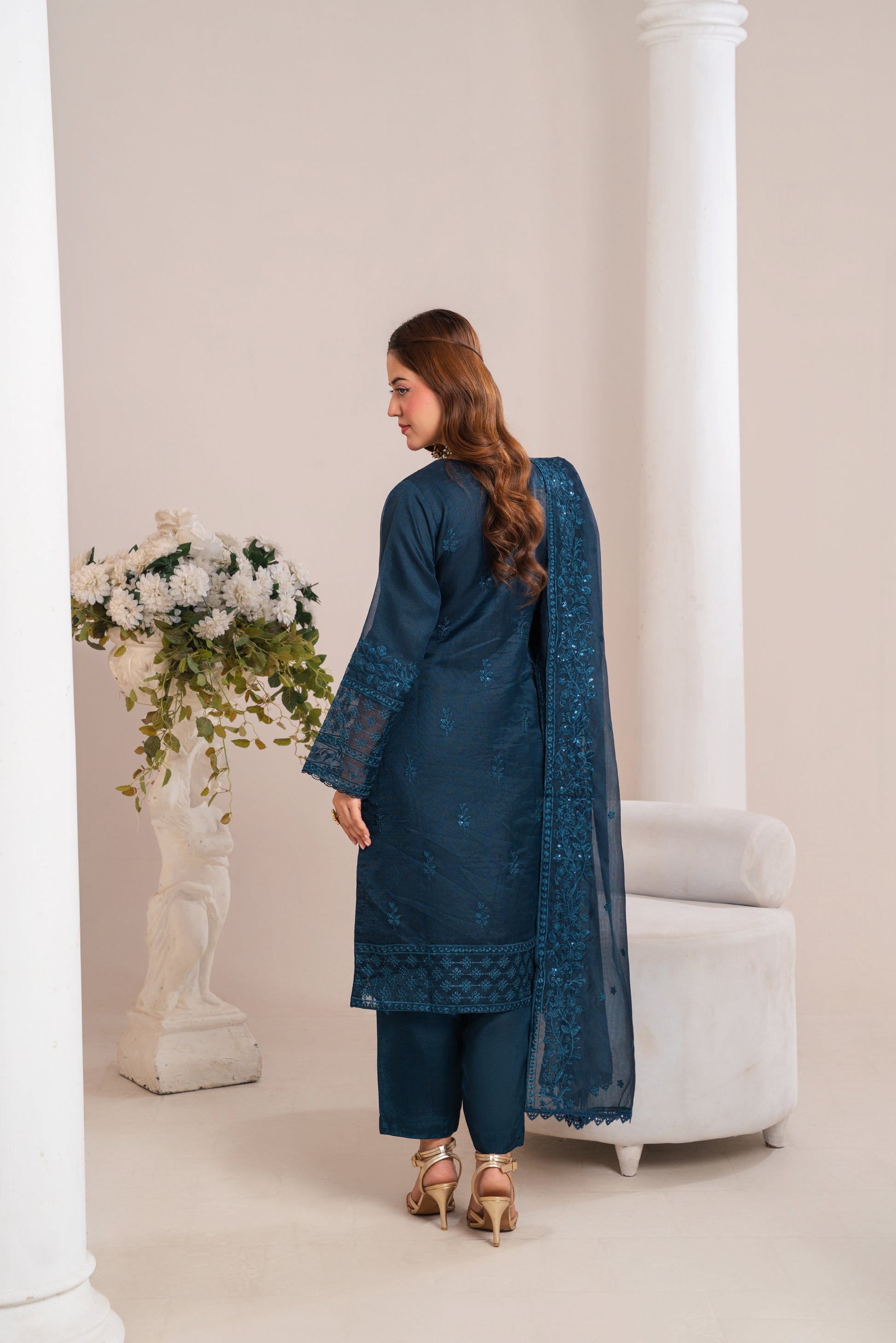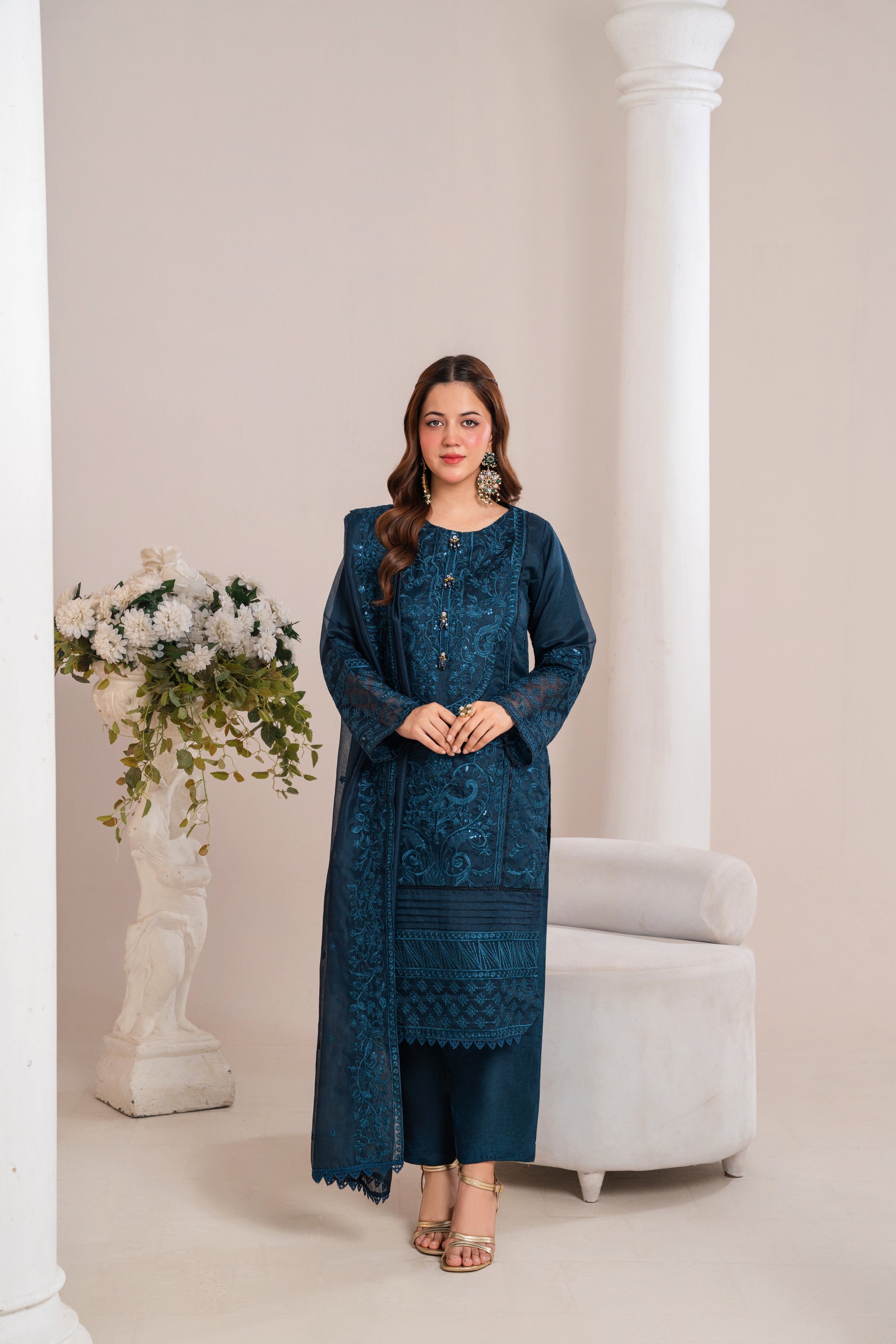 A classy blue outfit with intricate embroidery, ideal for both festive and formal occasions.