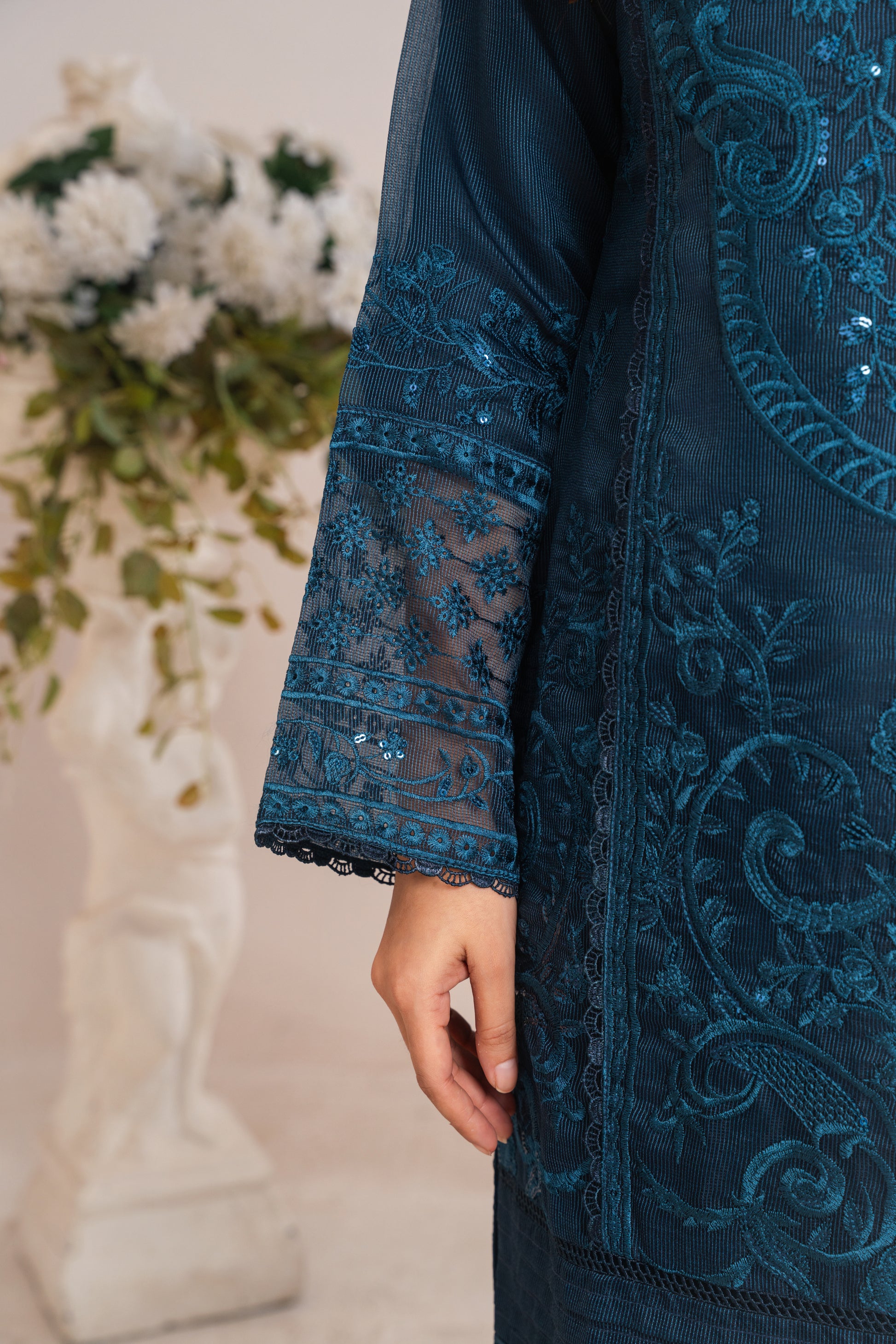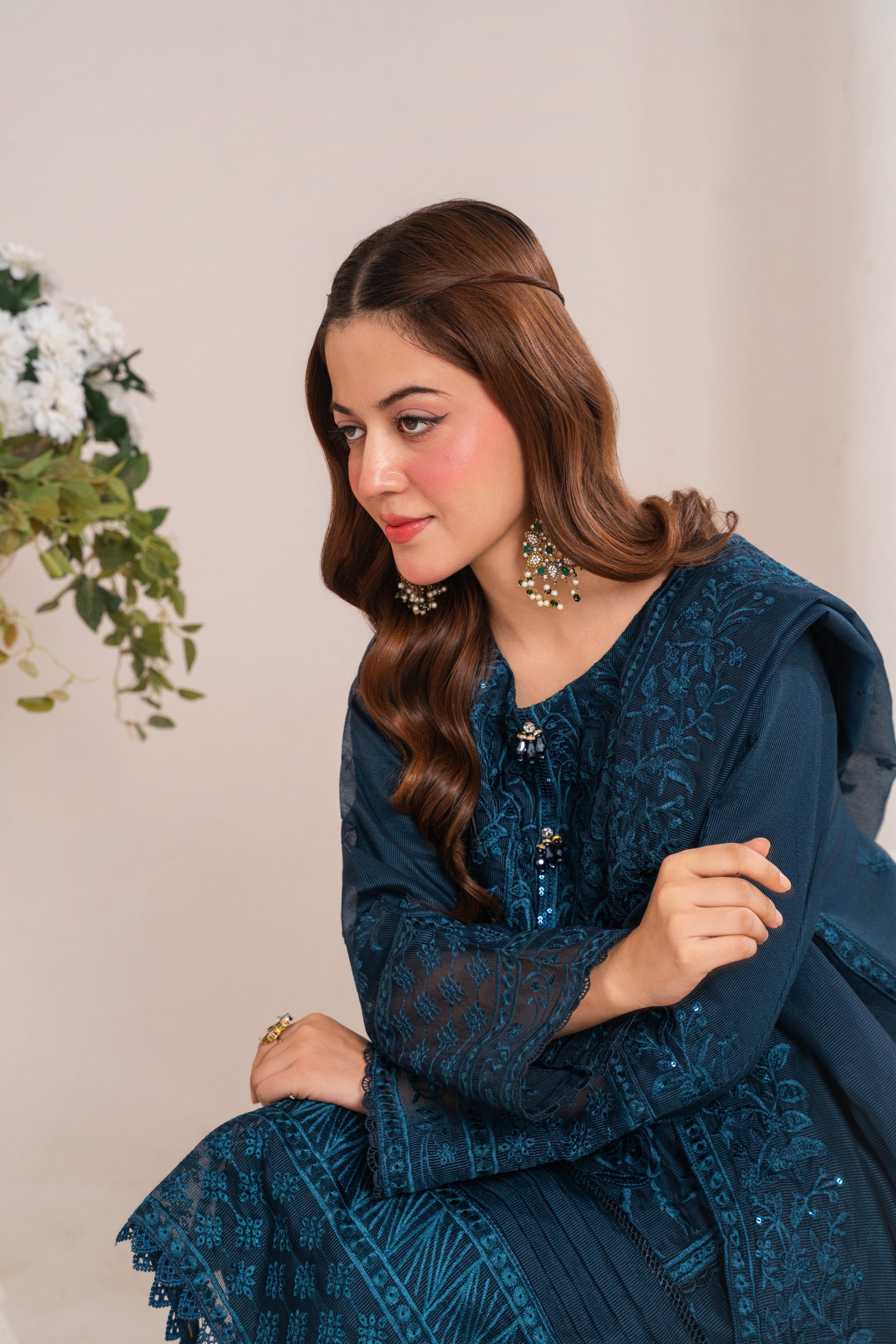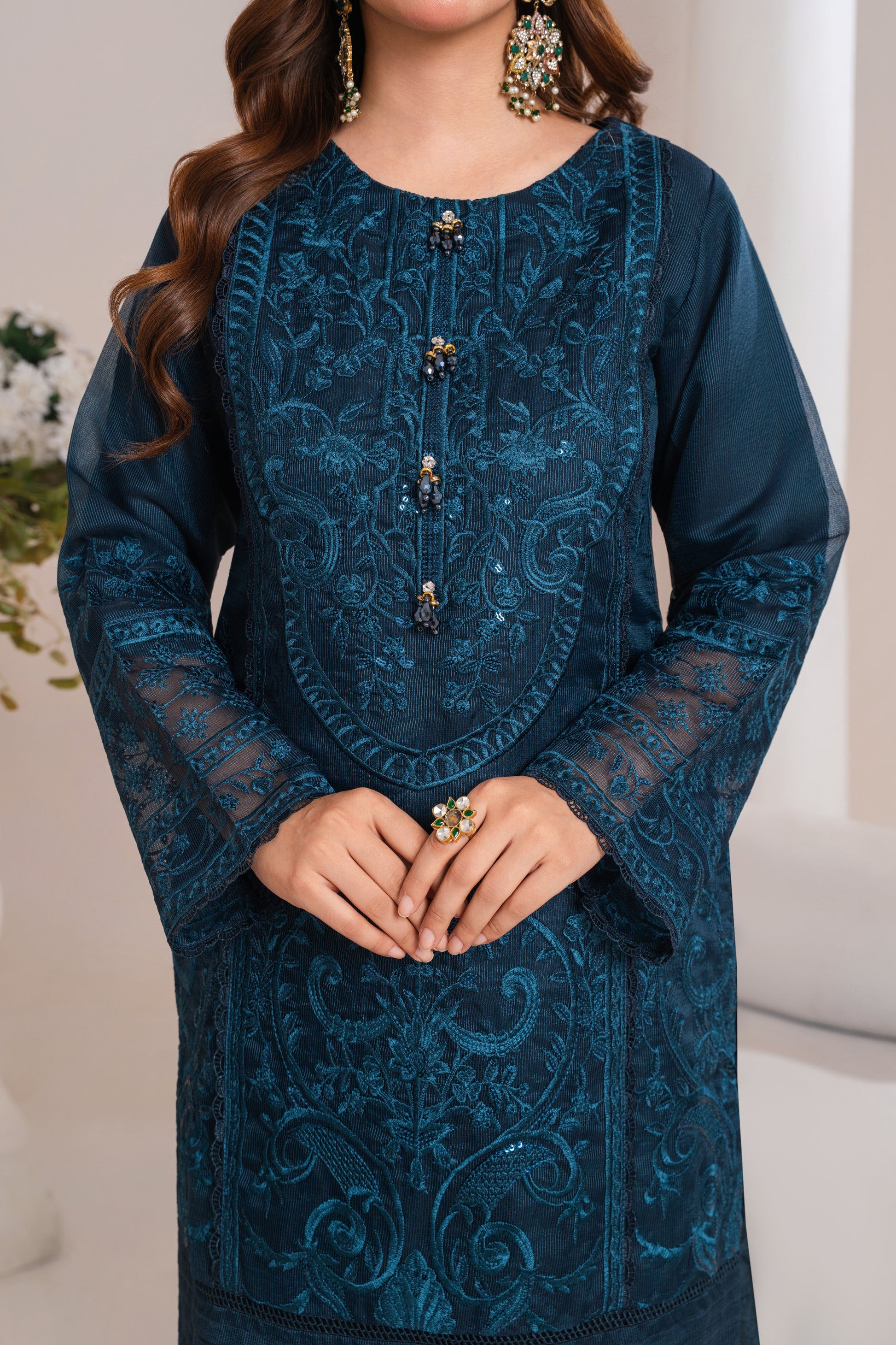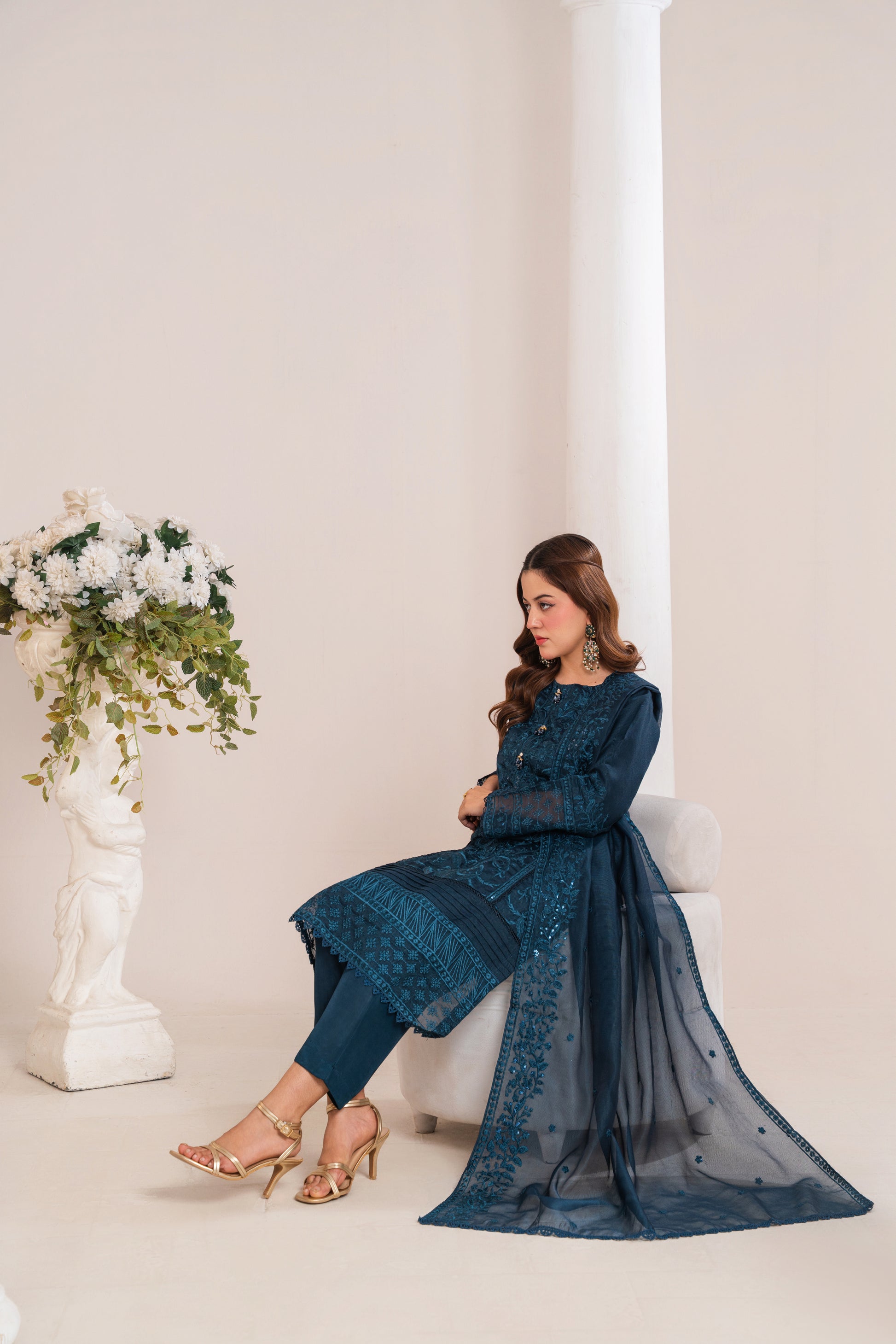A classy blue outfit with intricate embroidery, ideal for both festive and formal occasions.