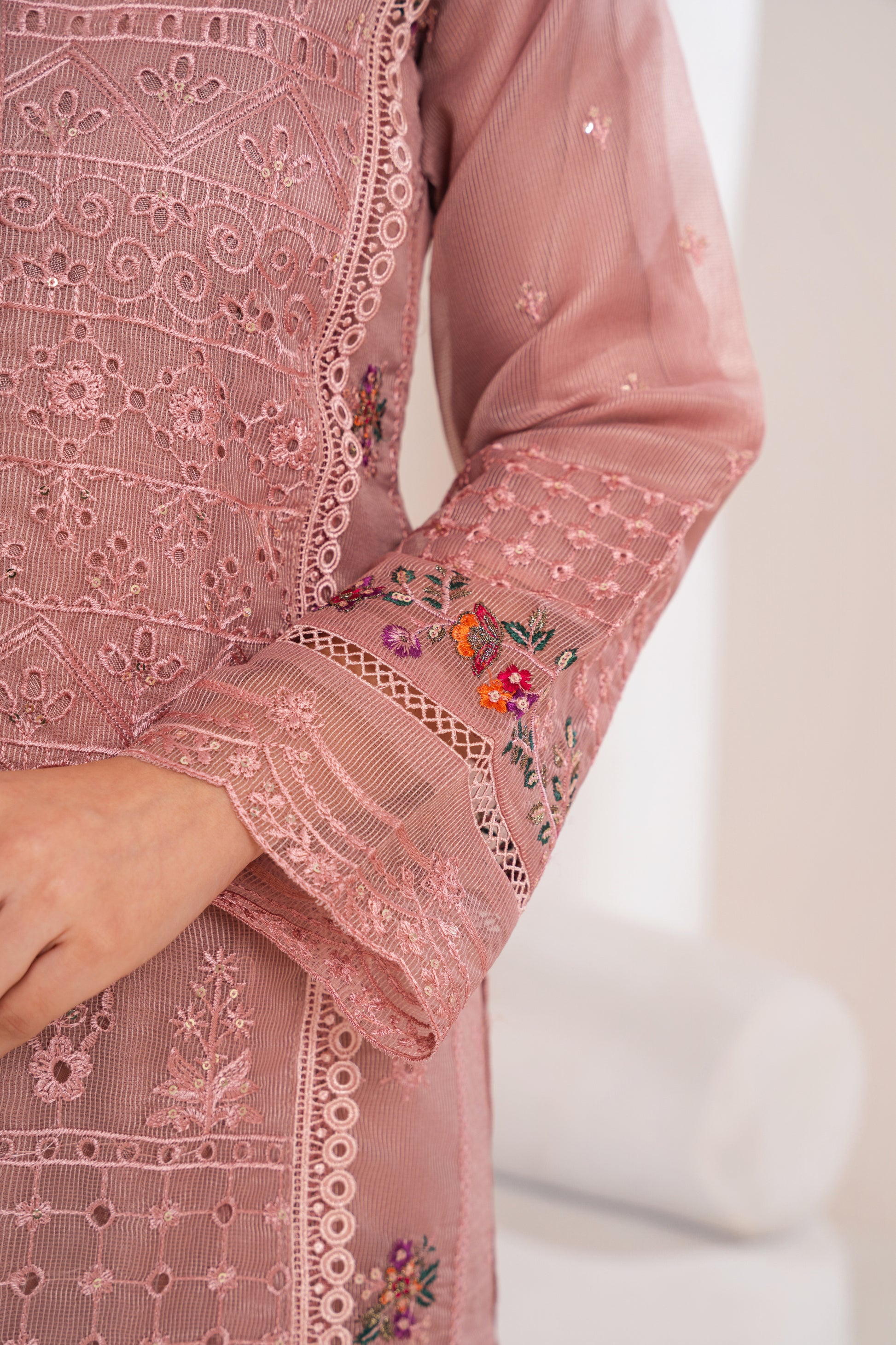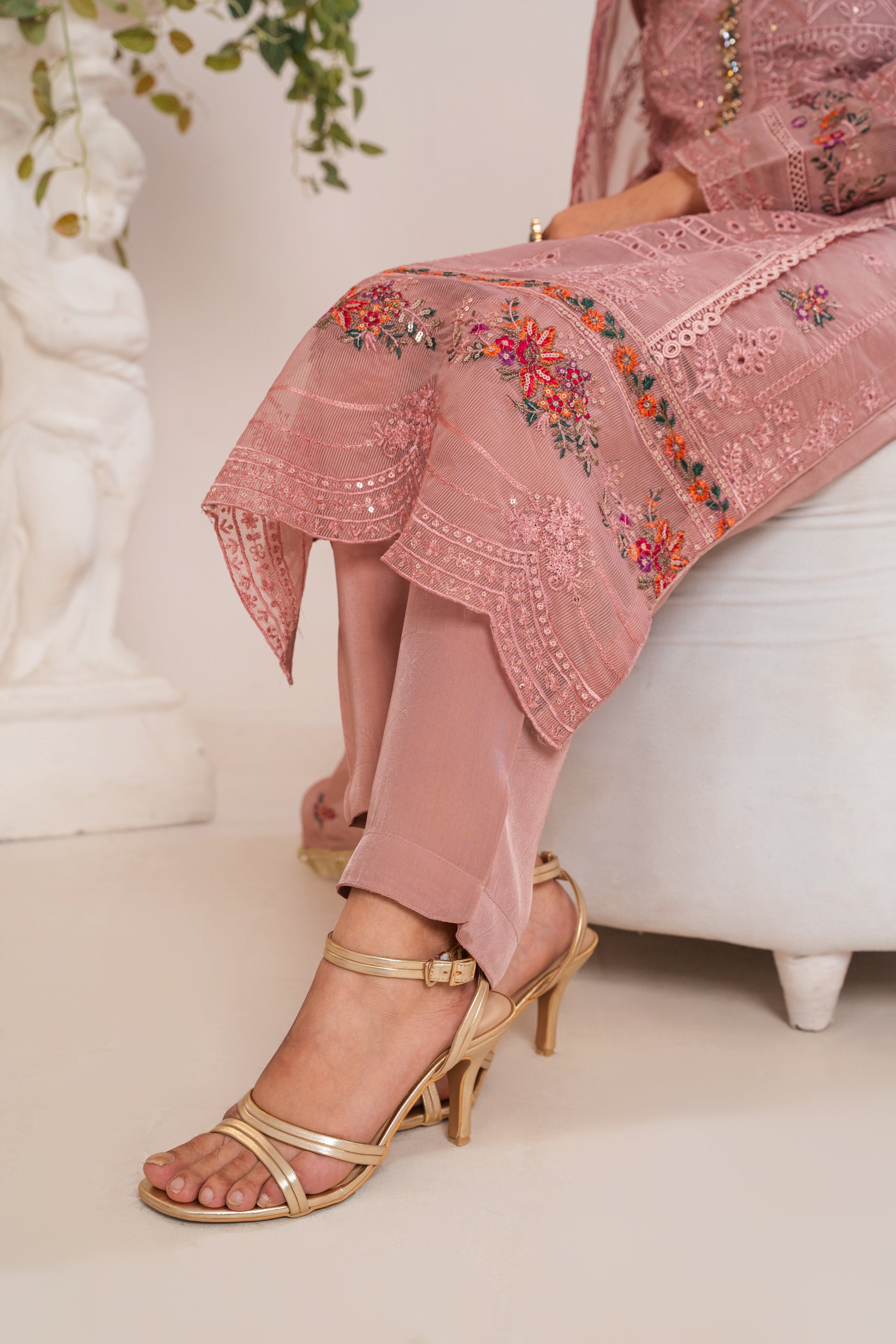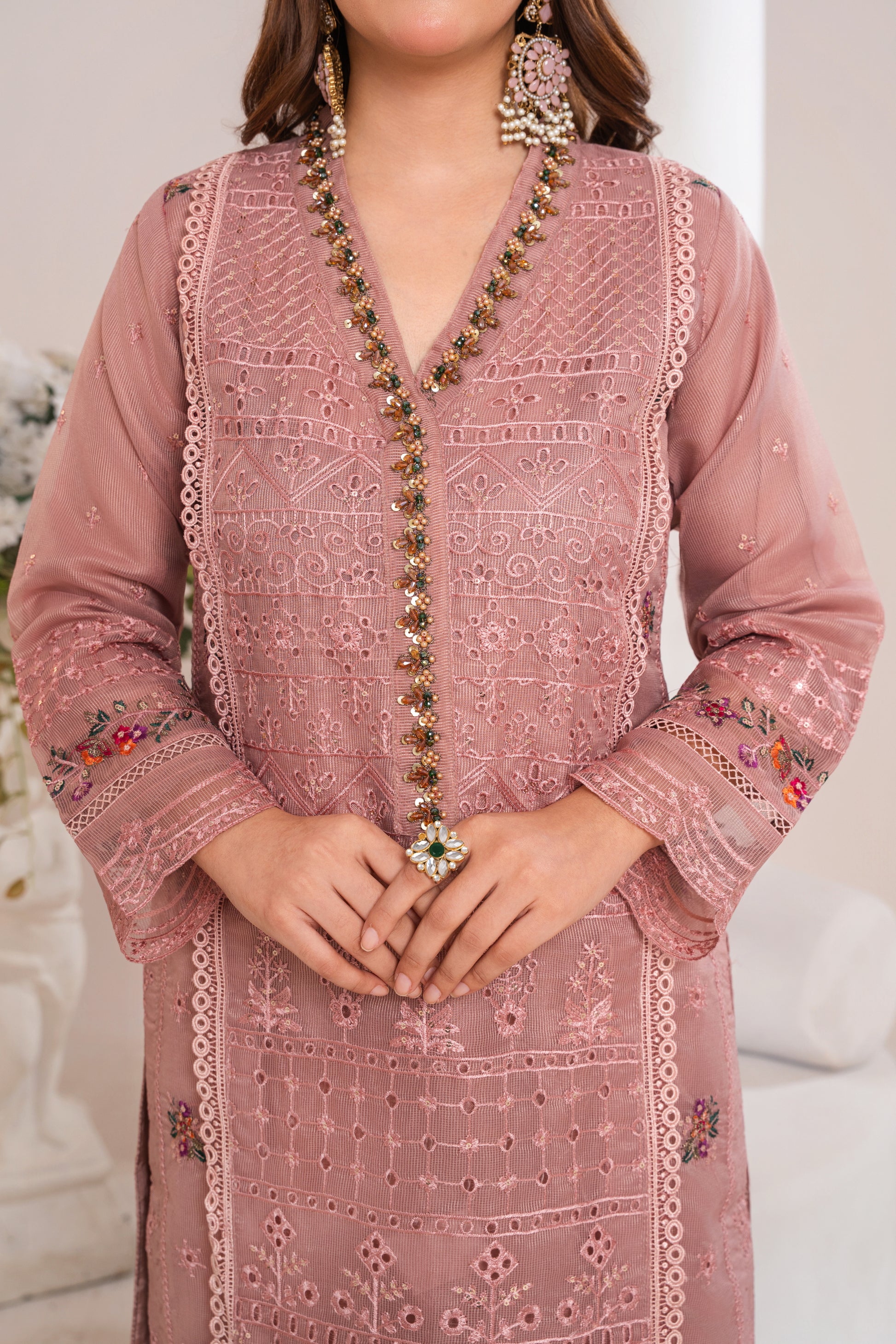 An elegant pink outfit beautifully detailed with delicate embroidery, perfect for festive and semi-formal occasions.