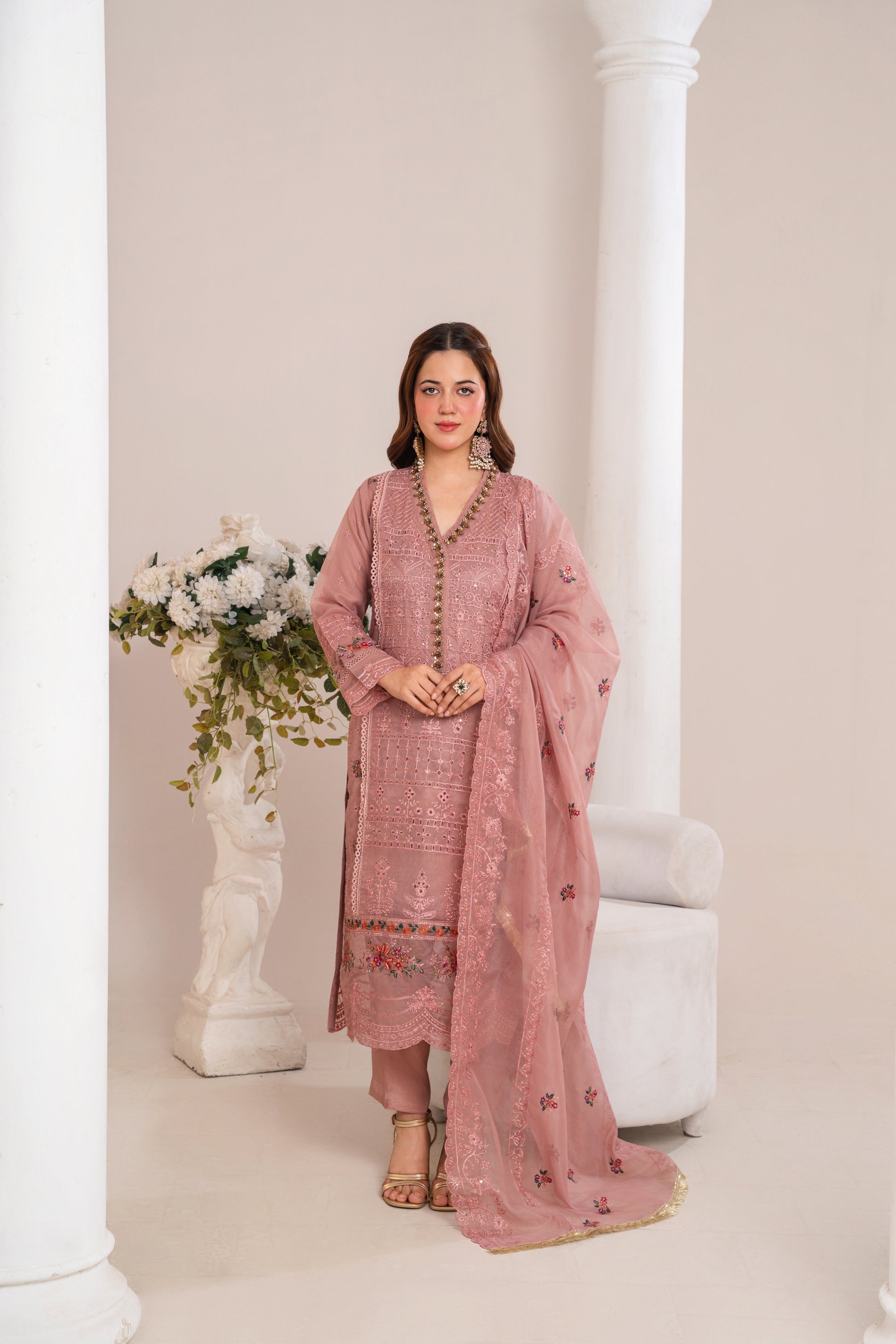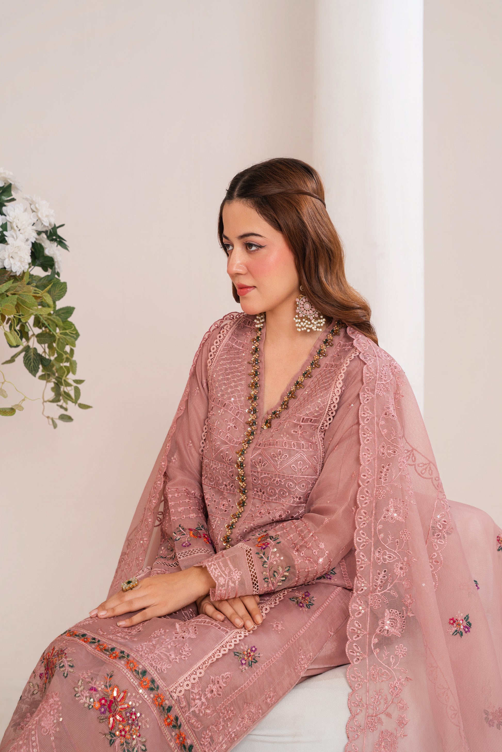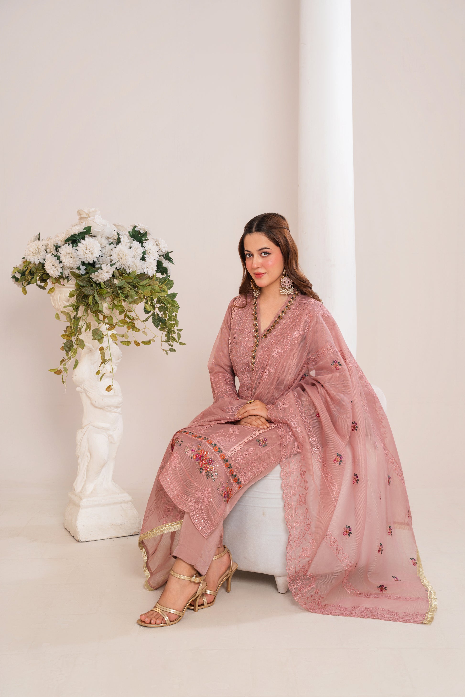 An elegant pink outfit beautifully detailed with delicate embroidery, perfect for festive and semi-formal occasions.