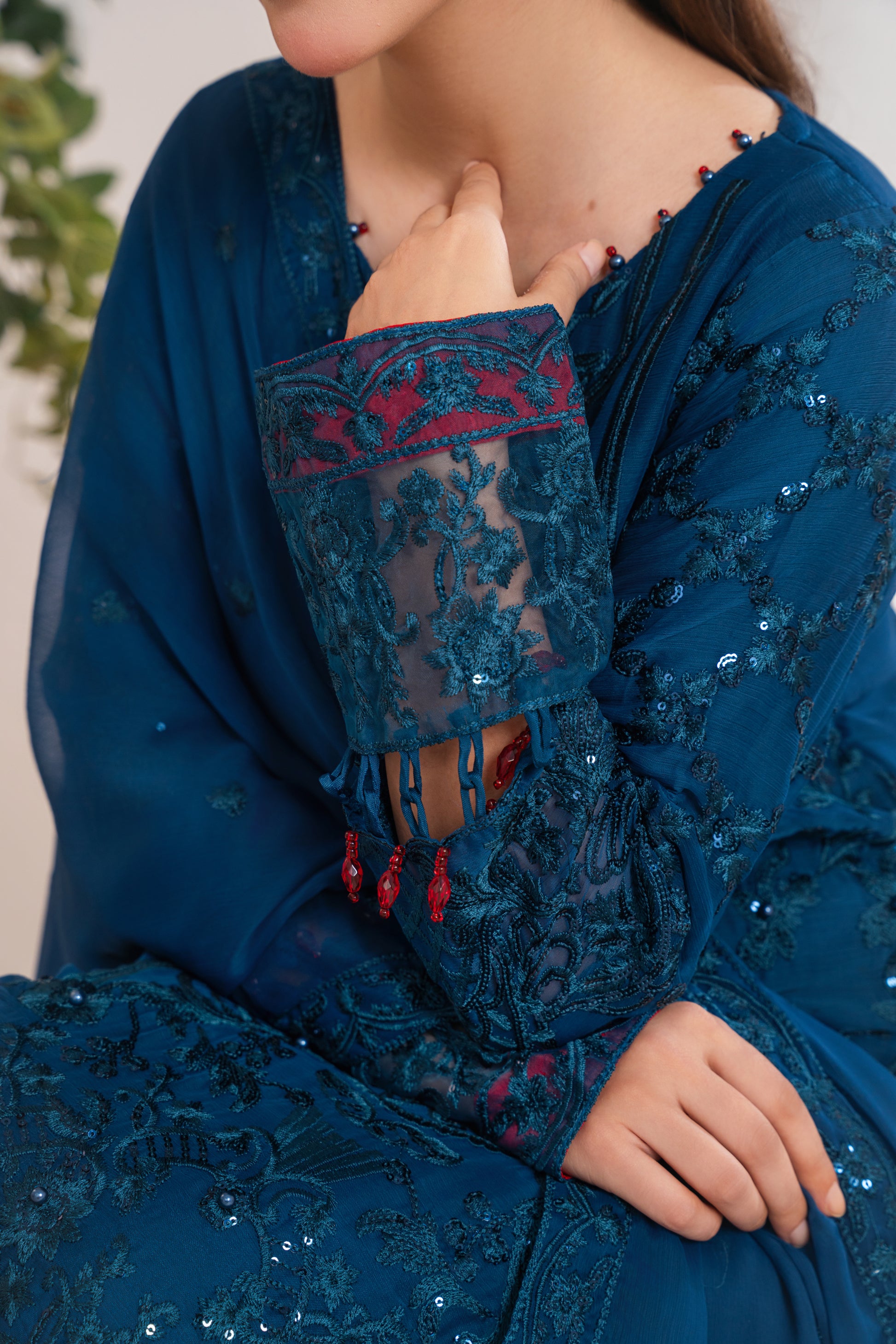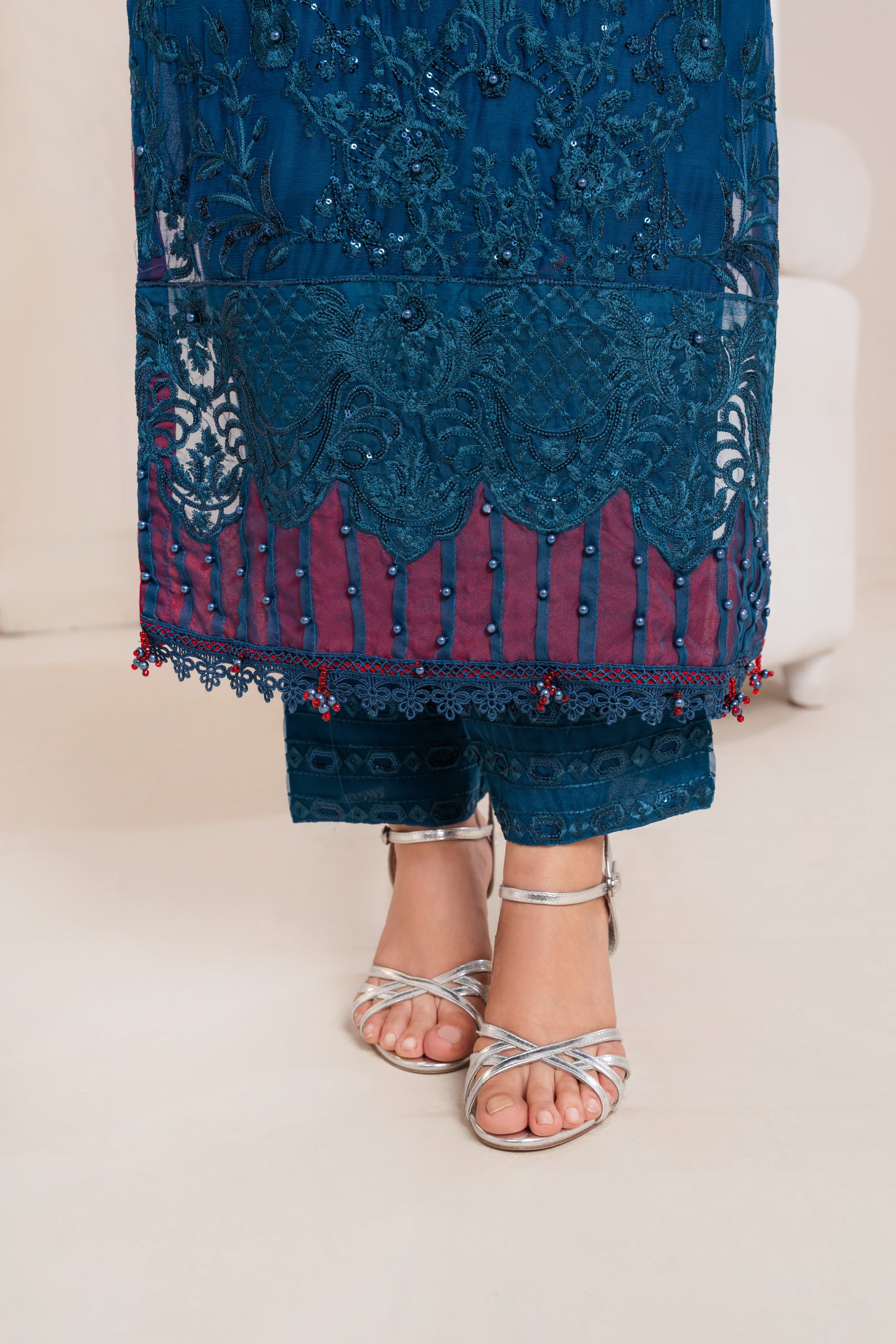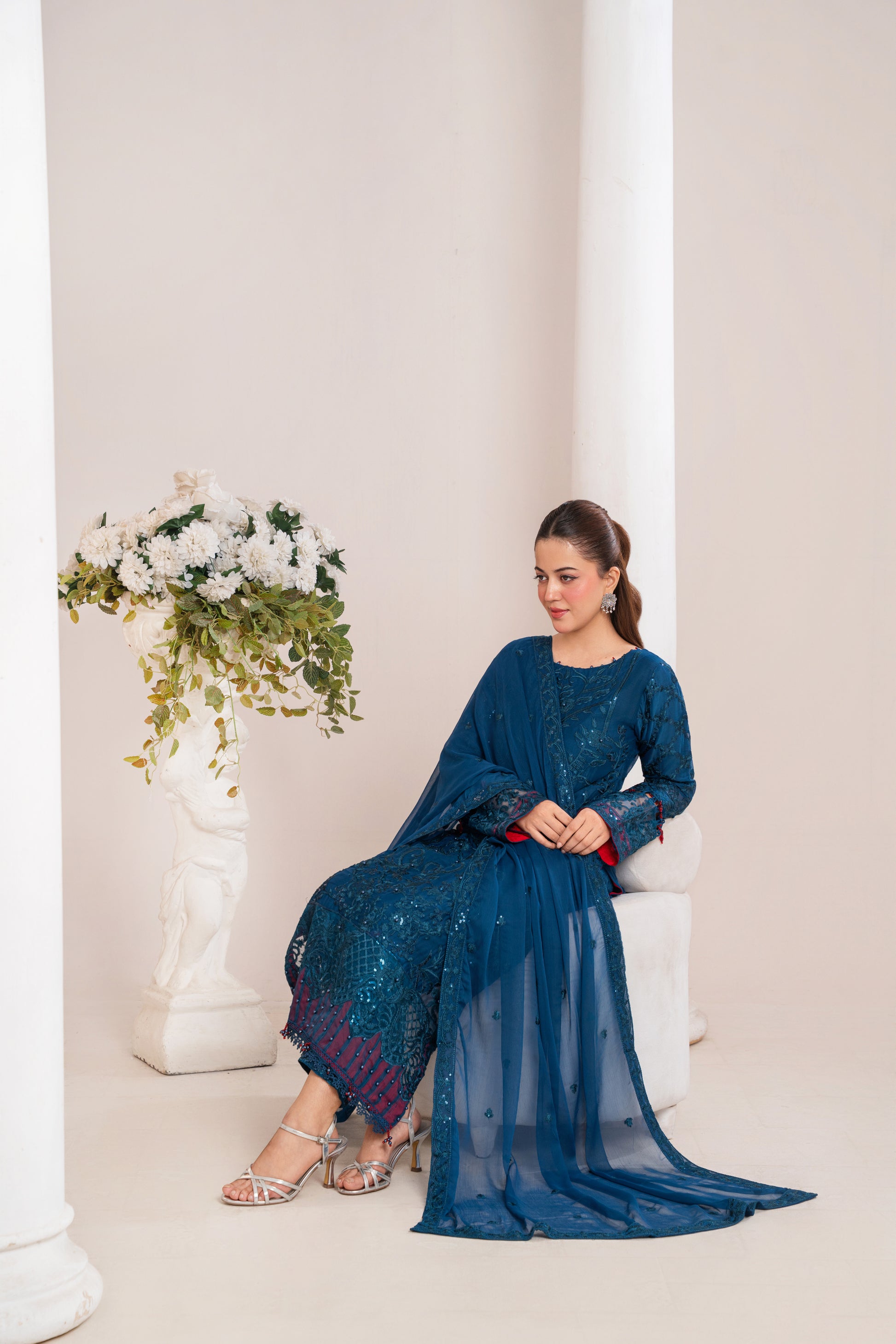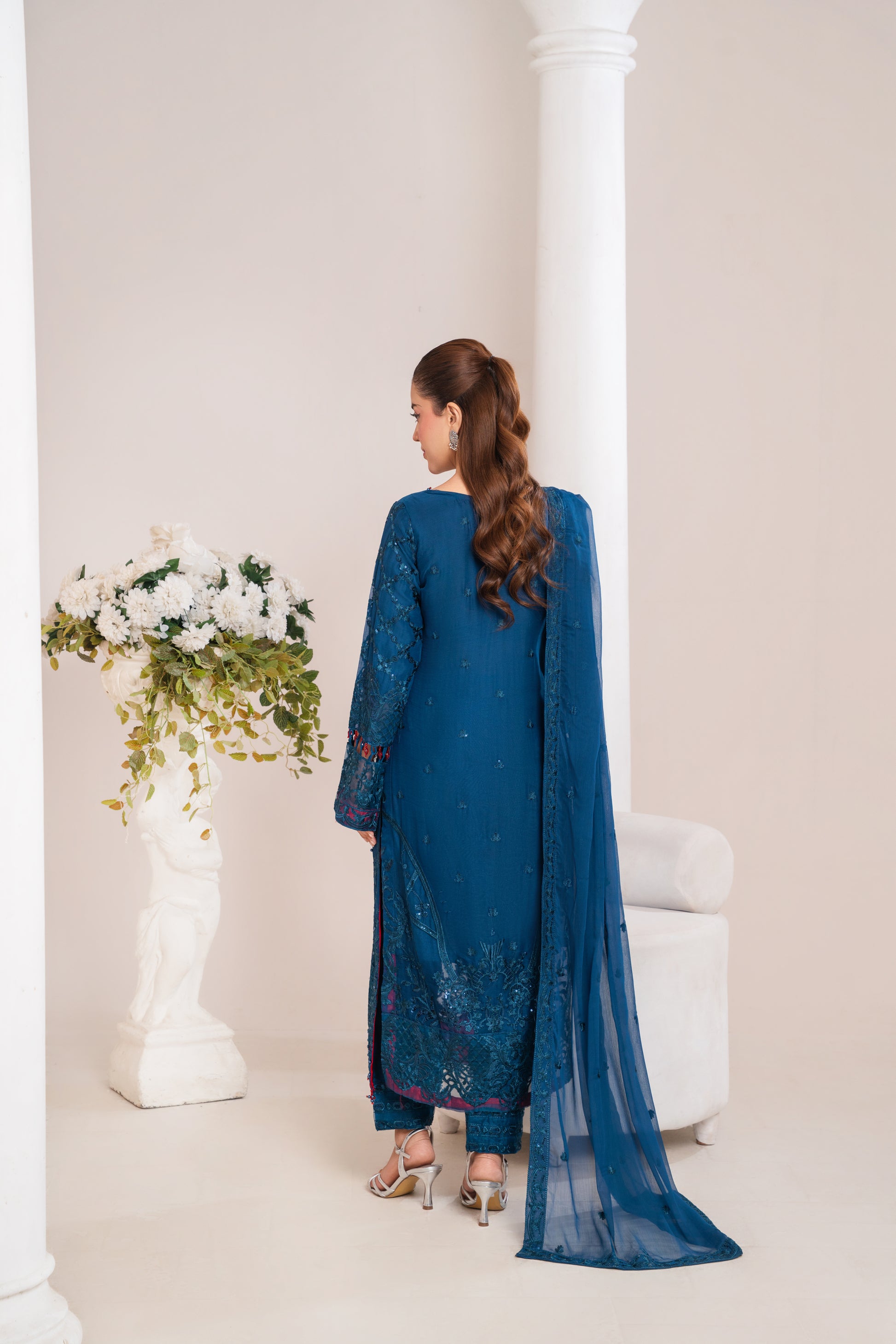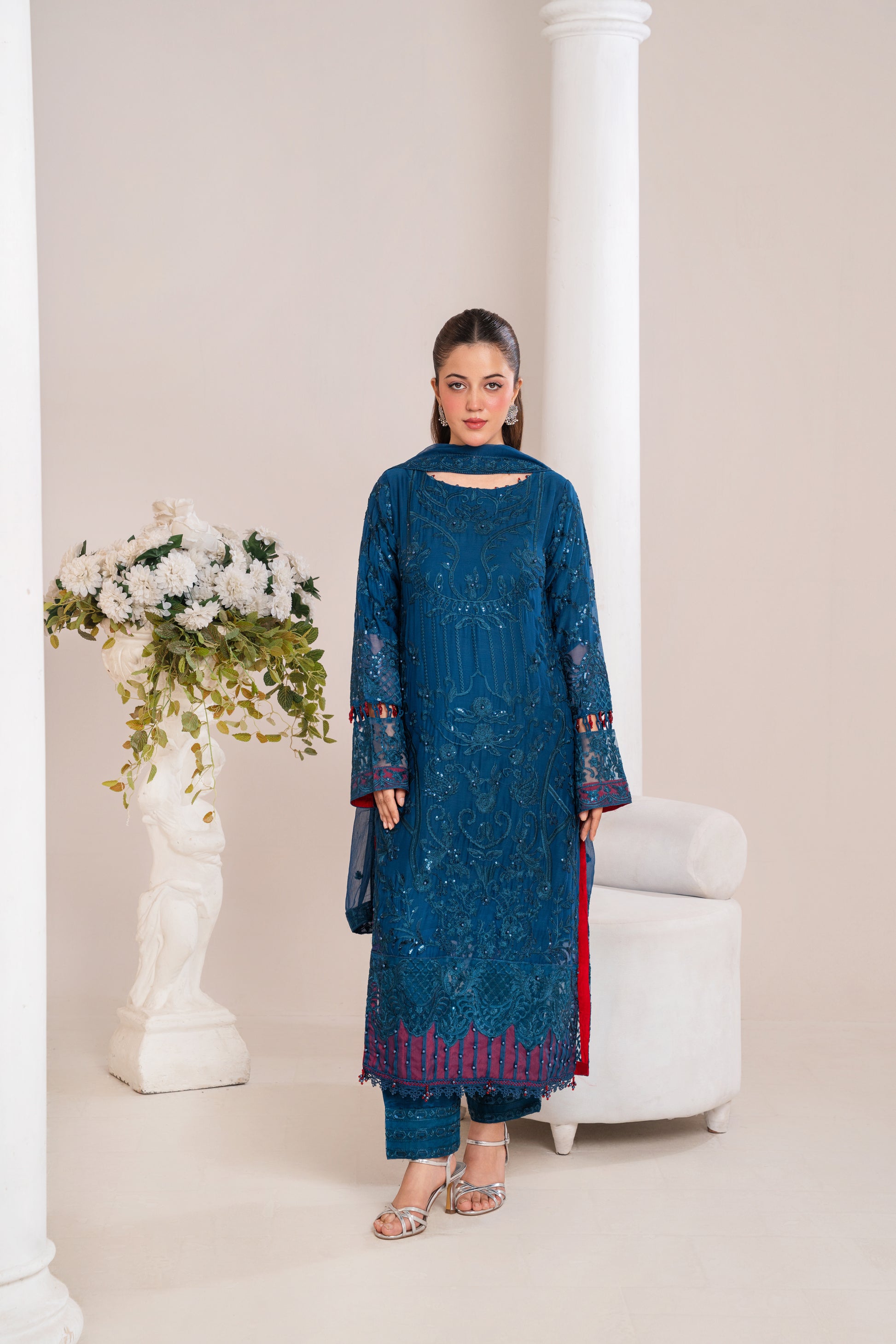 A stunning deep blue ensemble with elegant embroidery, perfect for festive and evening wear.