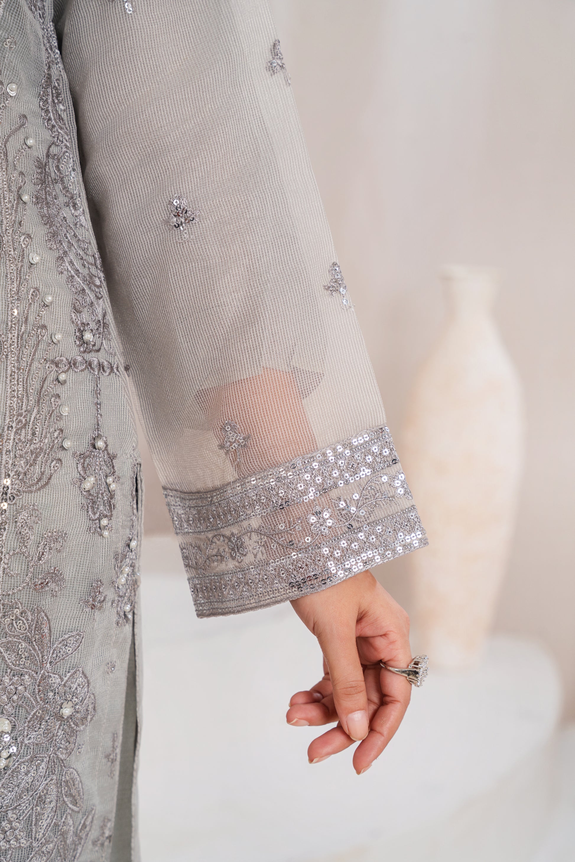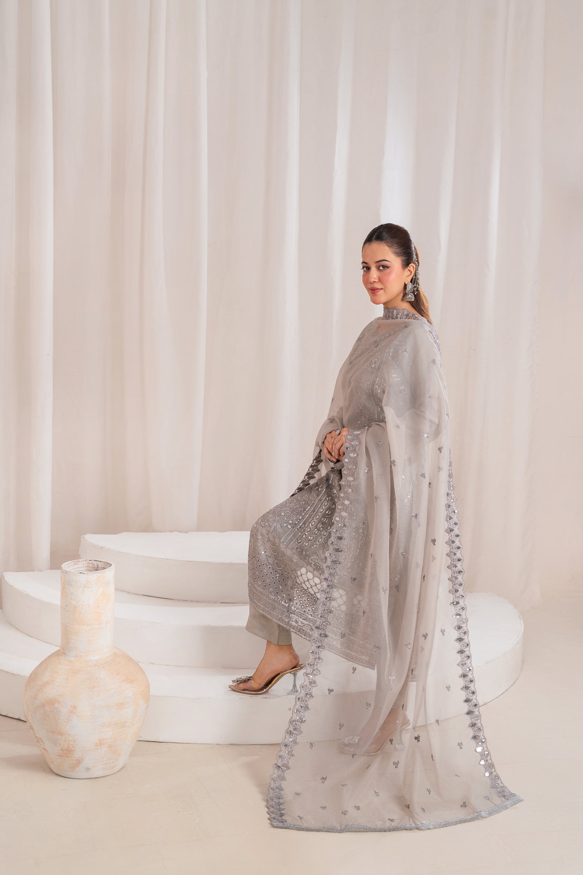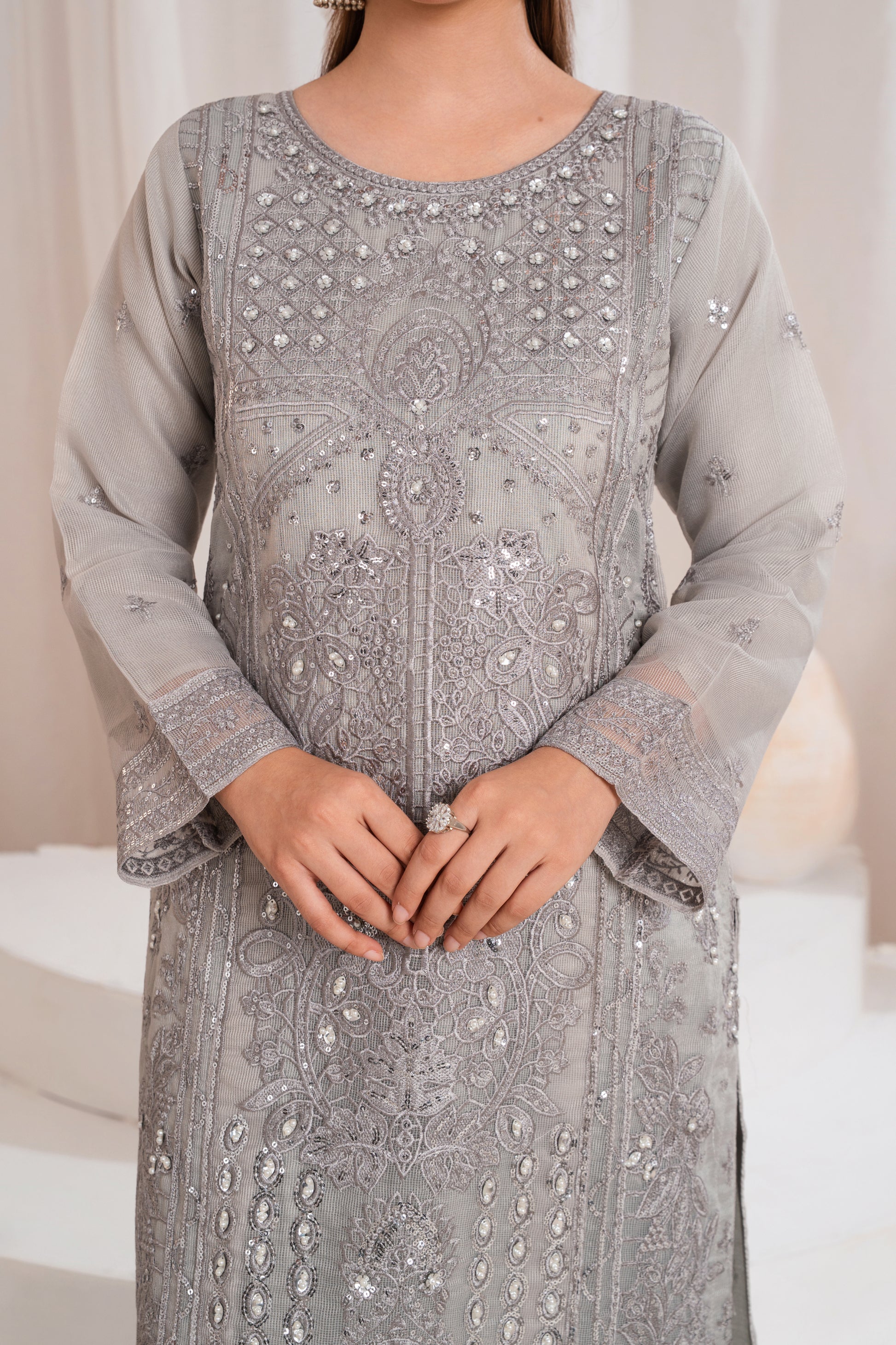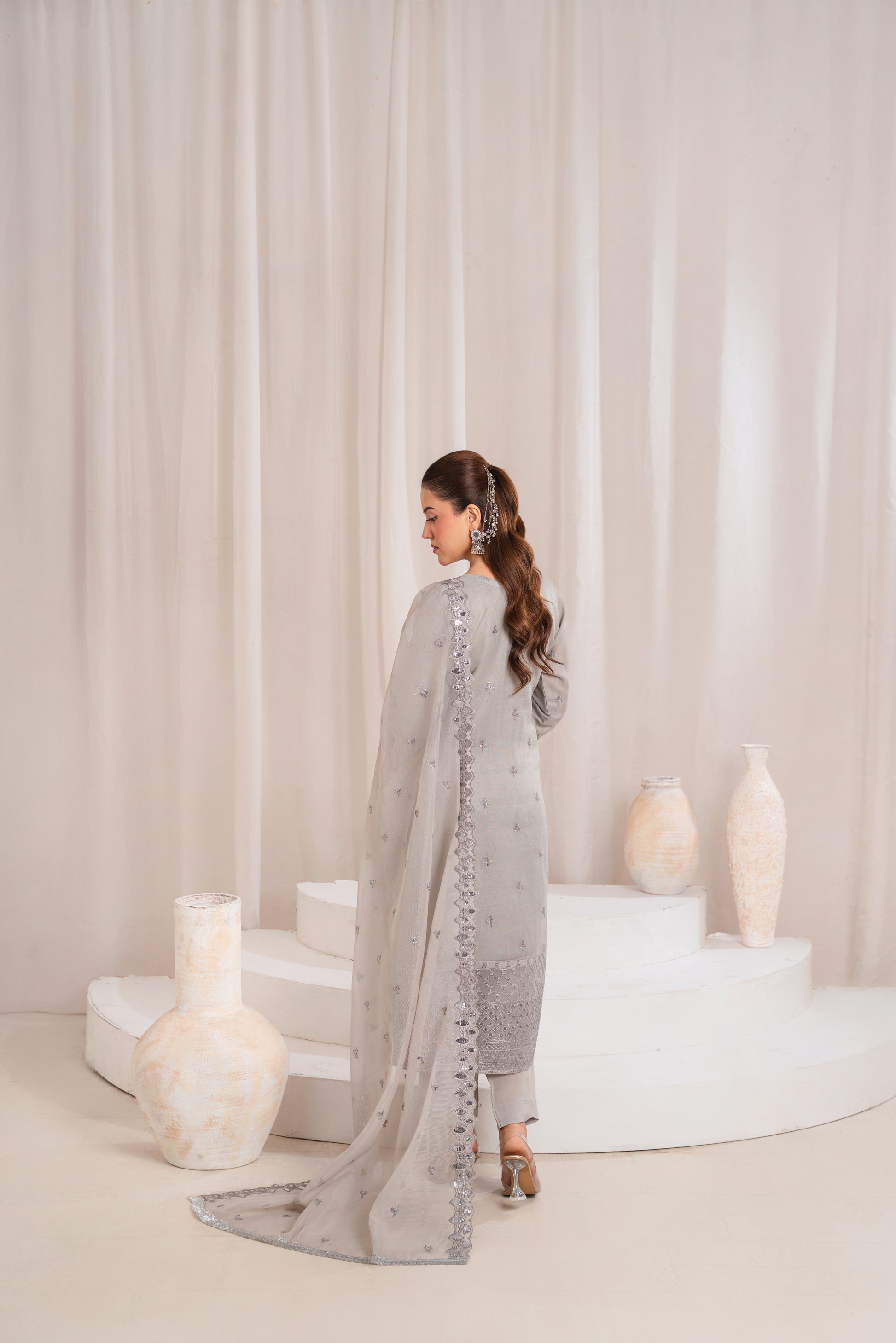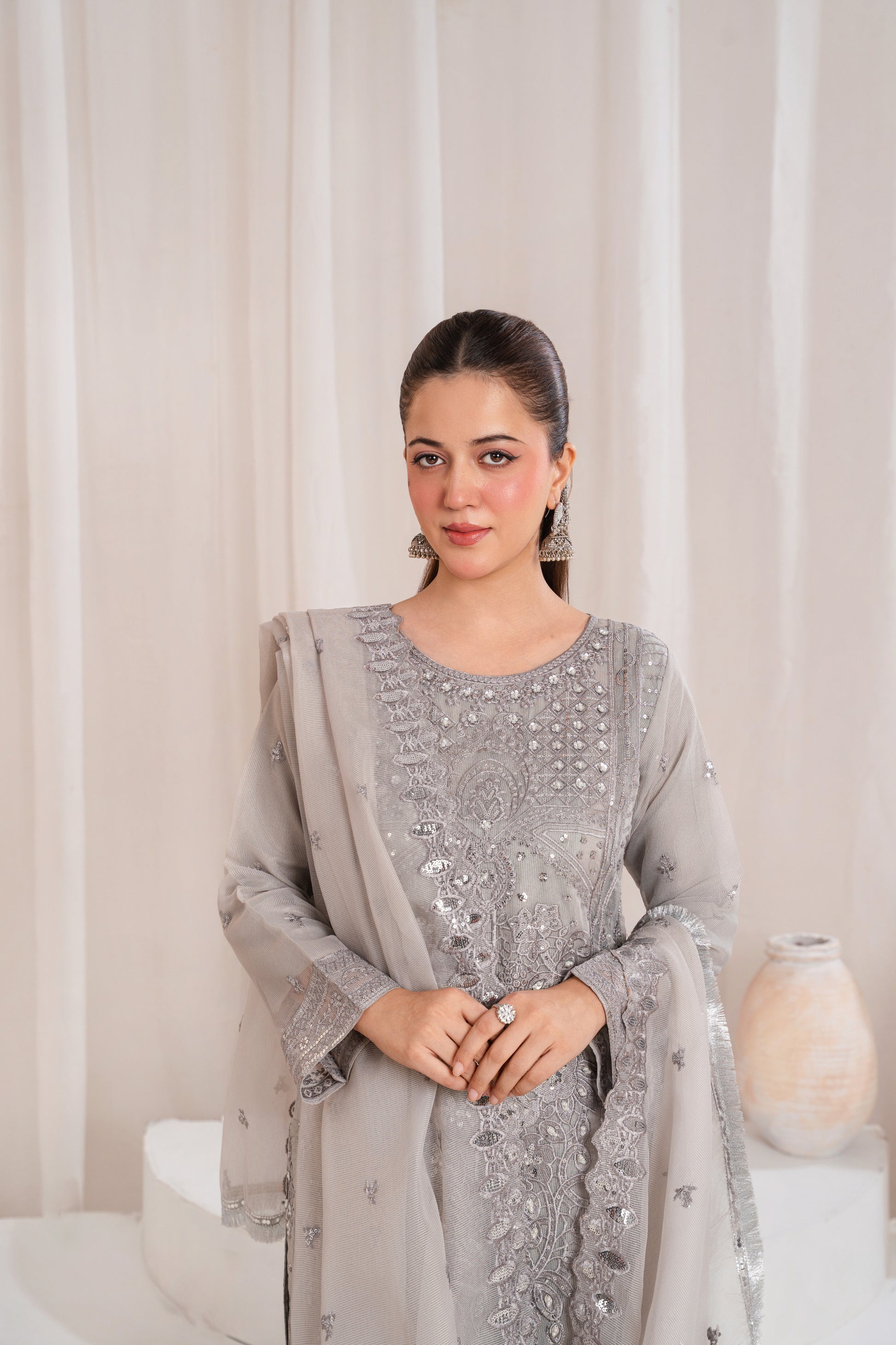 A graceful grey outfit with intricate embroidery, creating a refined and timeless festive look.