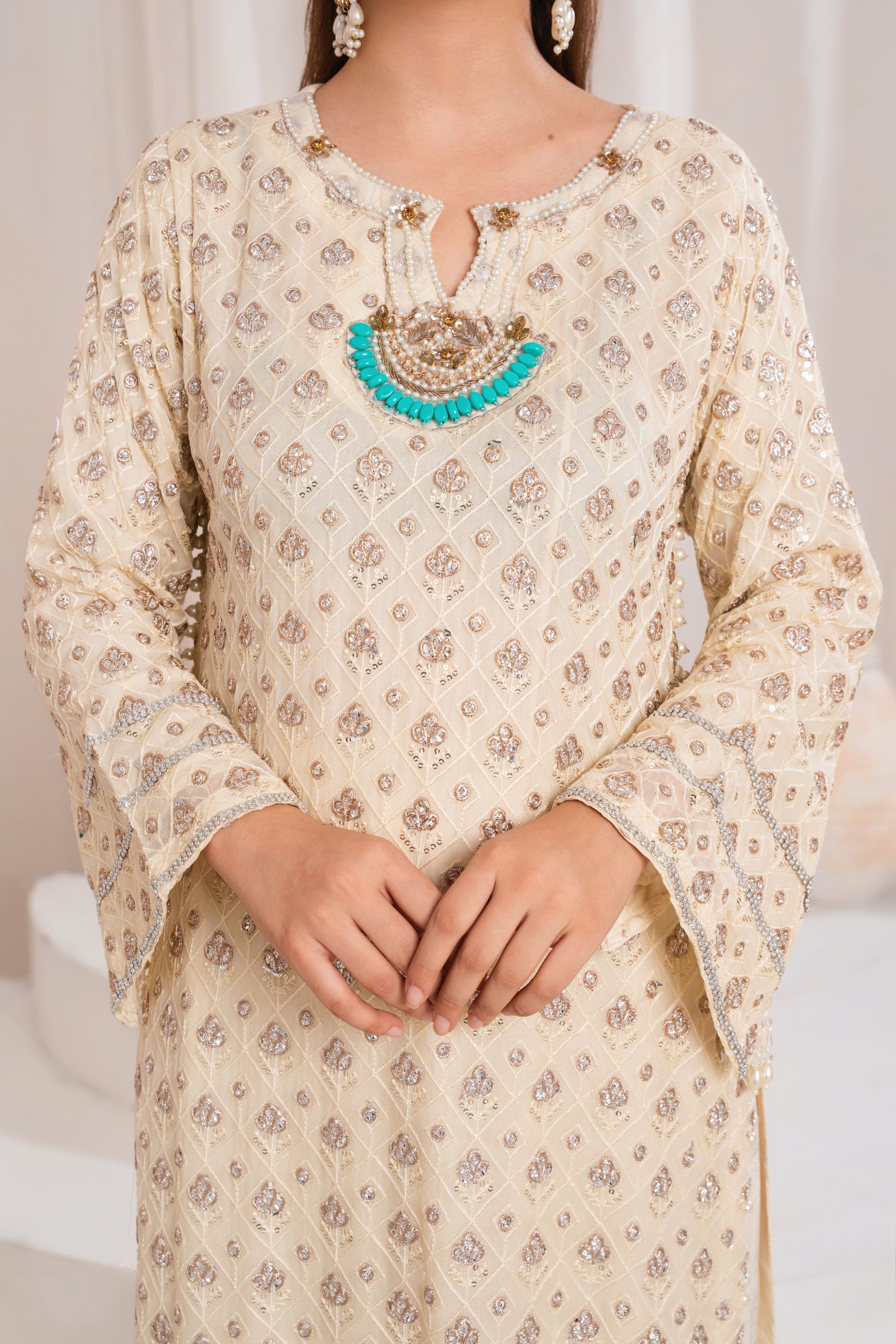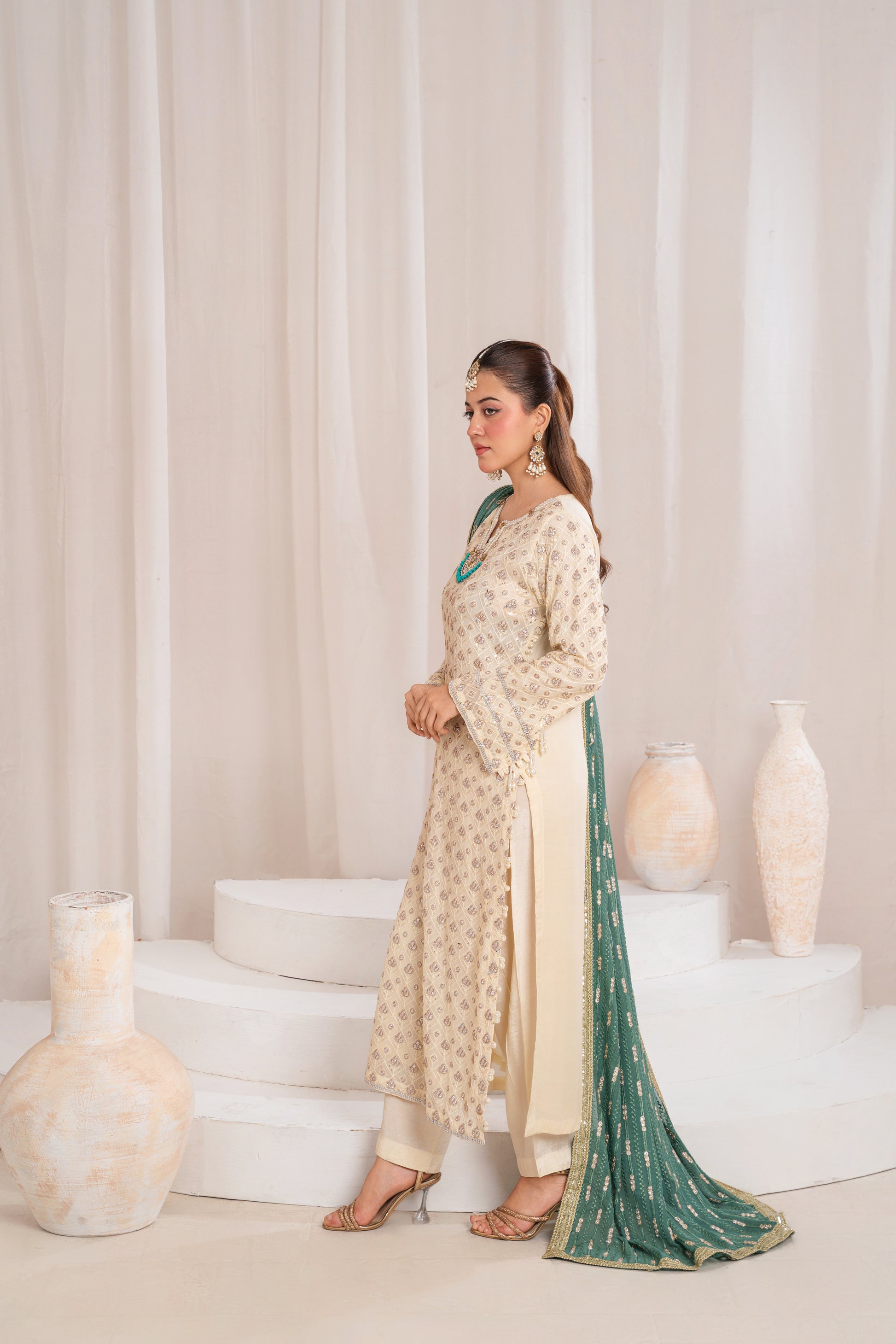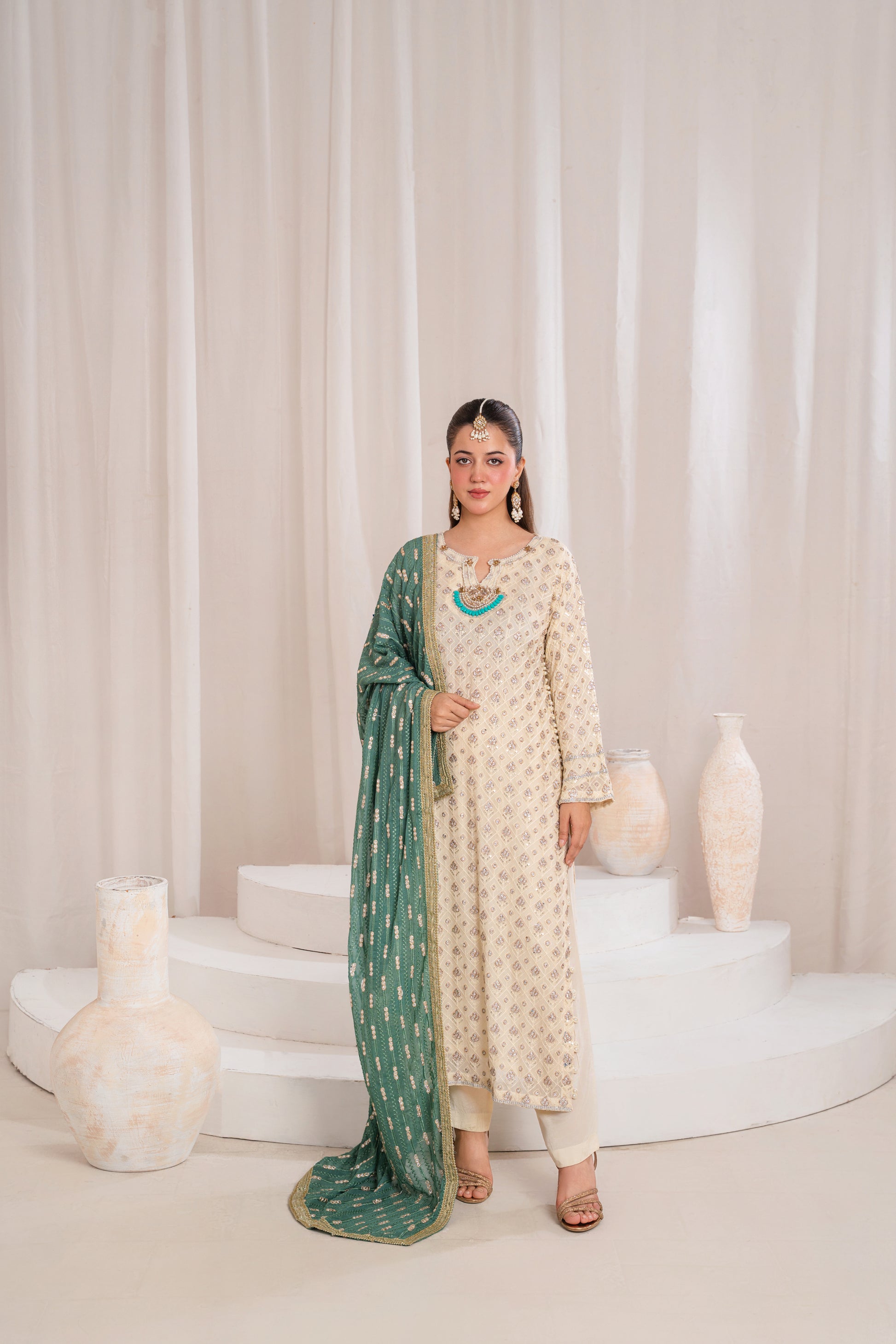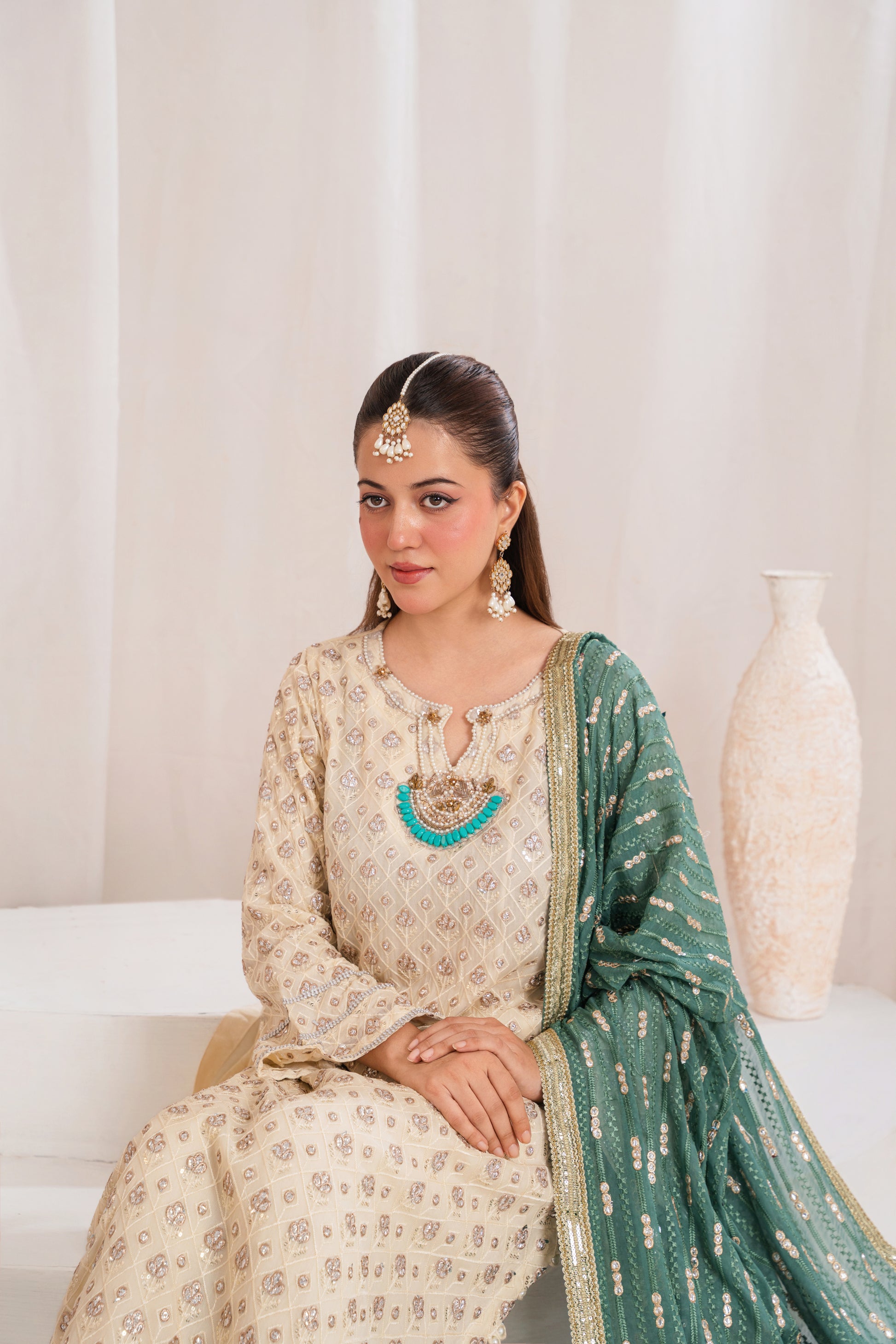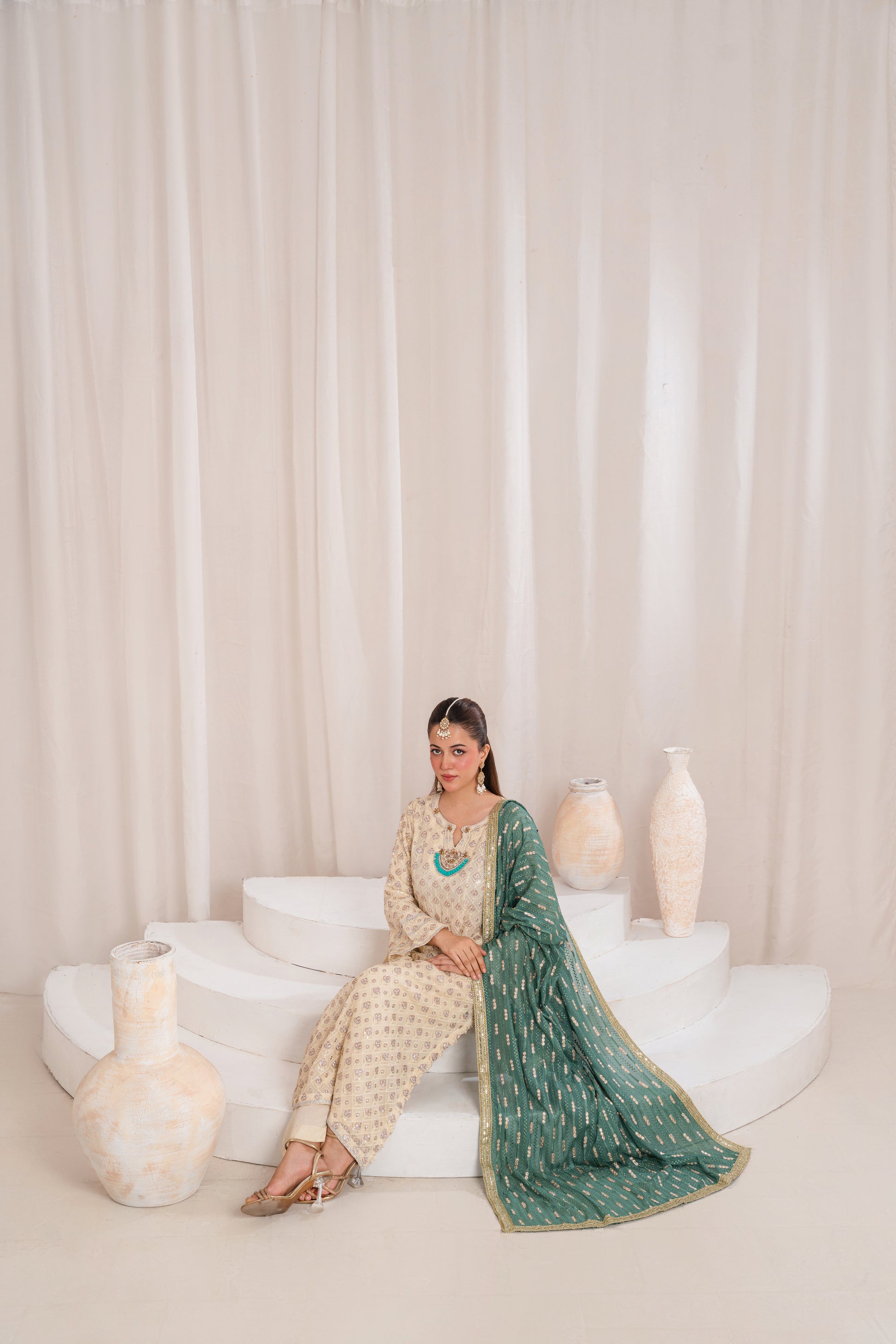 A classy cream outfit with delicate embroidery, paired with a contrasting green dupatta for an elegant festive look.