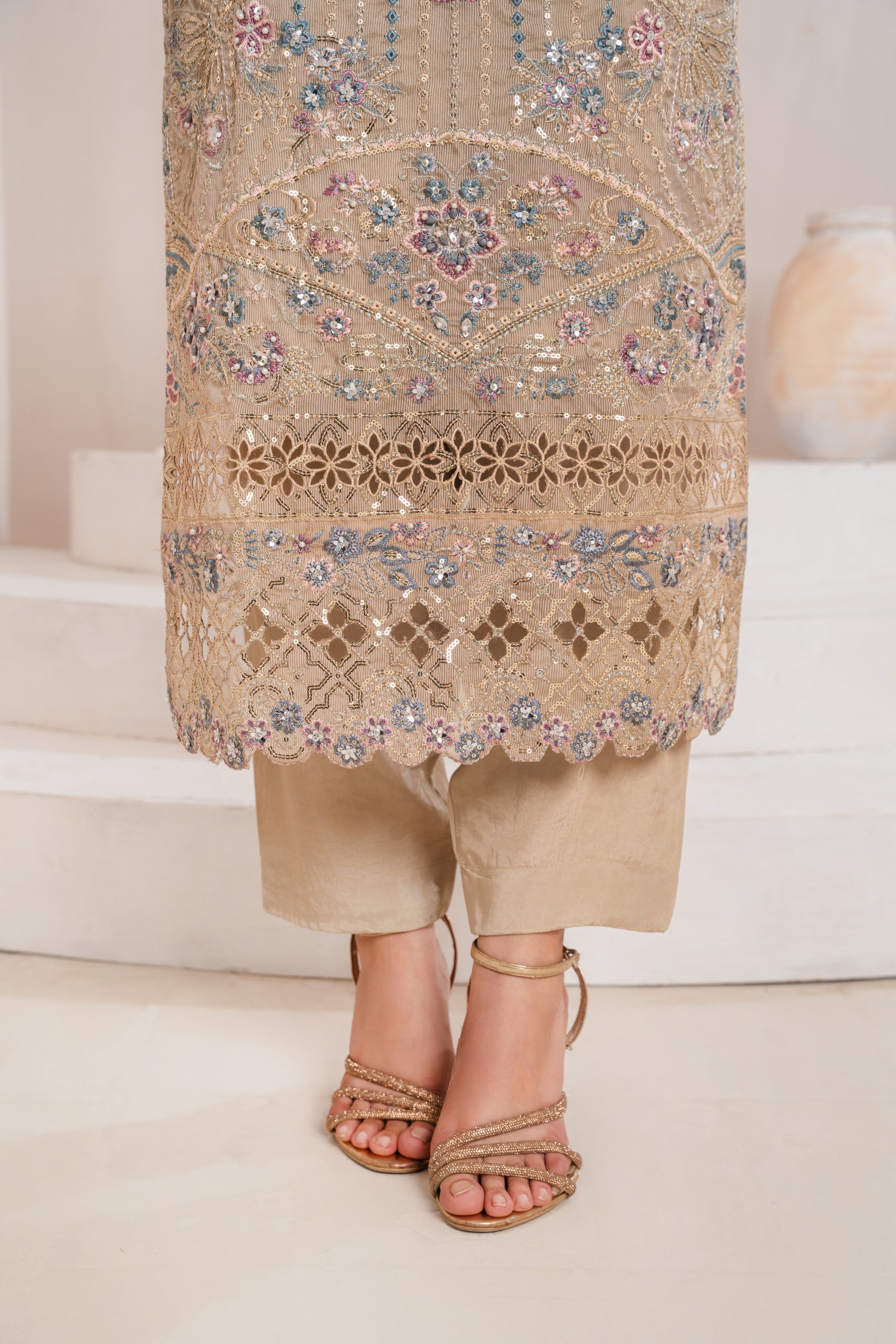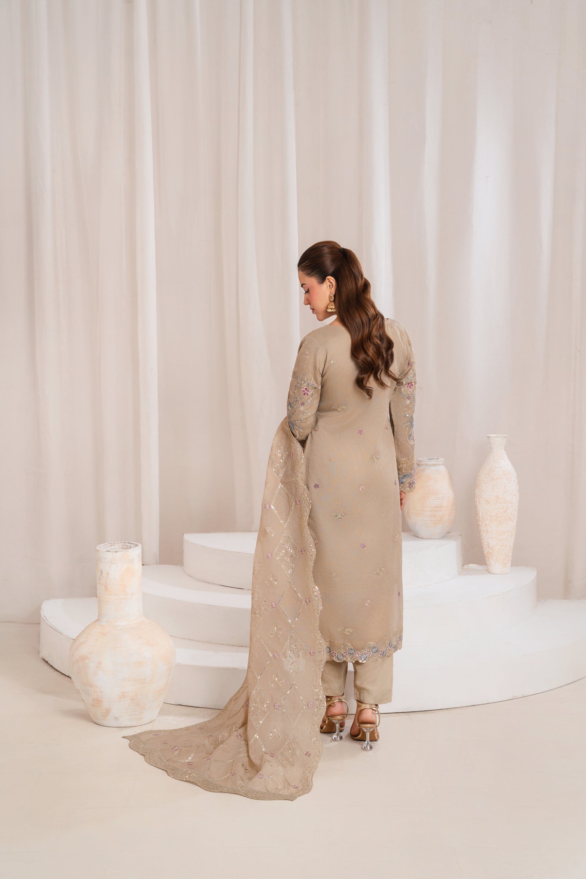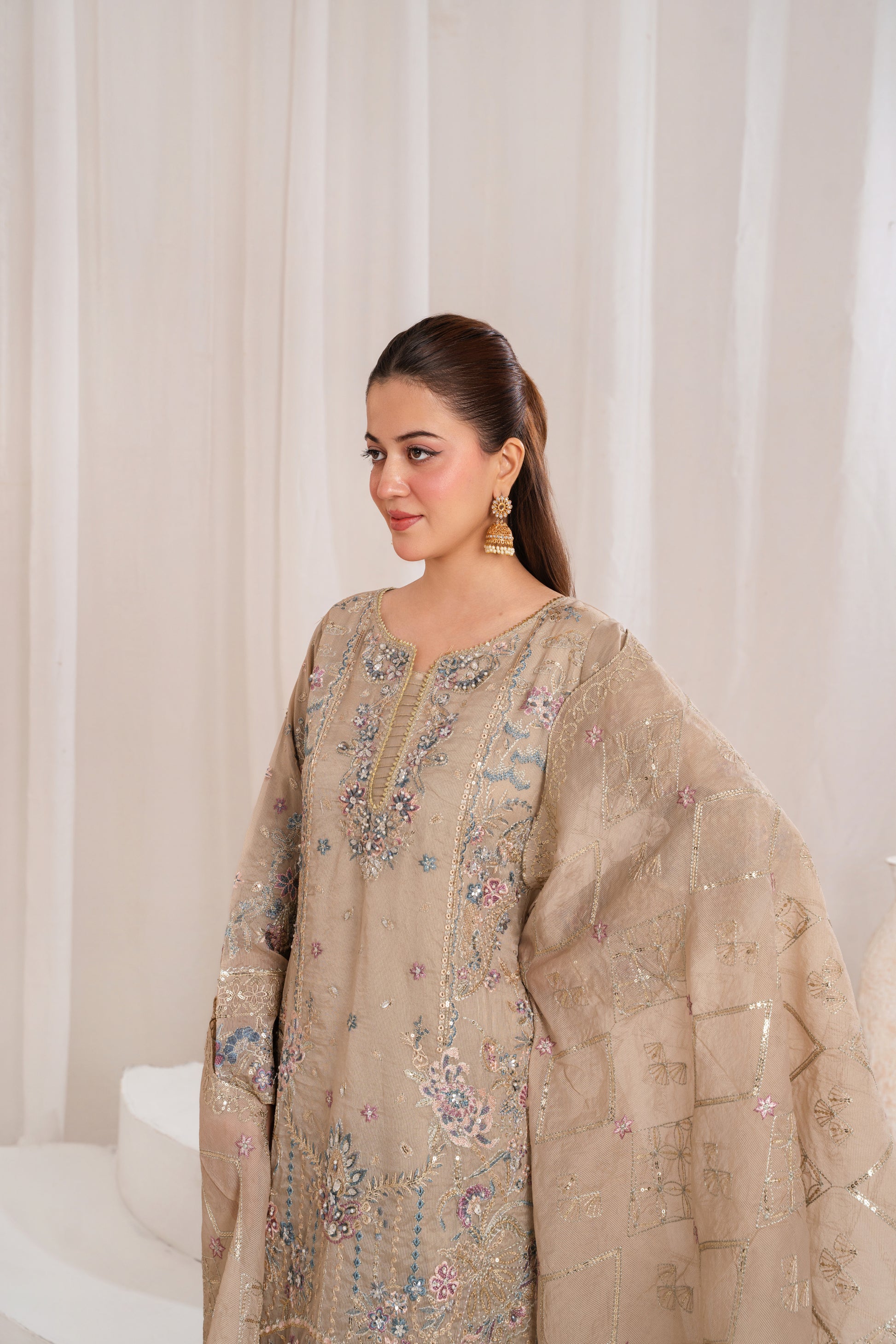 Elegant beige embroidered outfit featuring a Khaadi net shirt and Khaadi net dupatta, paired with a Russian grip trouser β€” perfect for festive and formal occasions.
