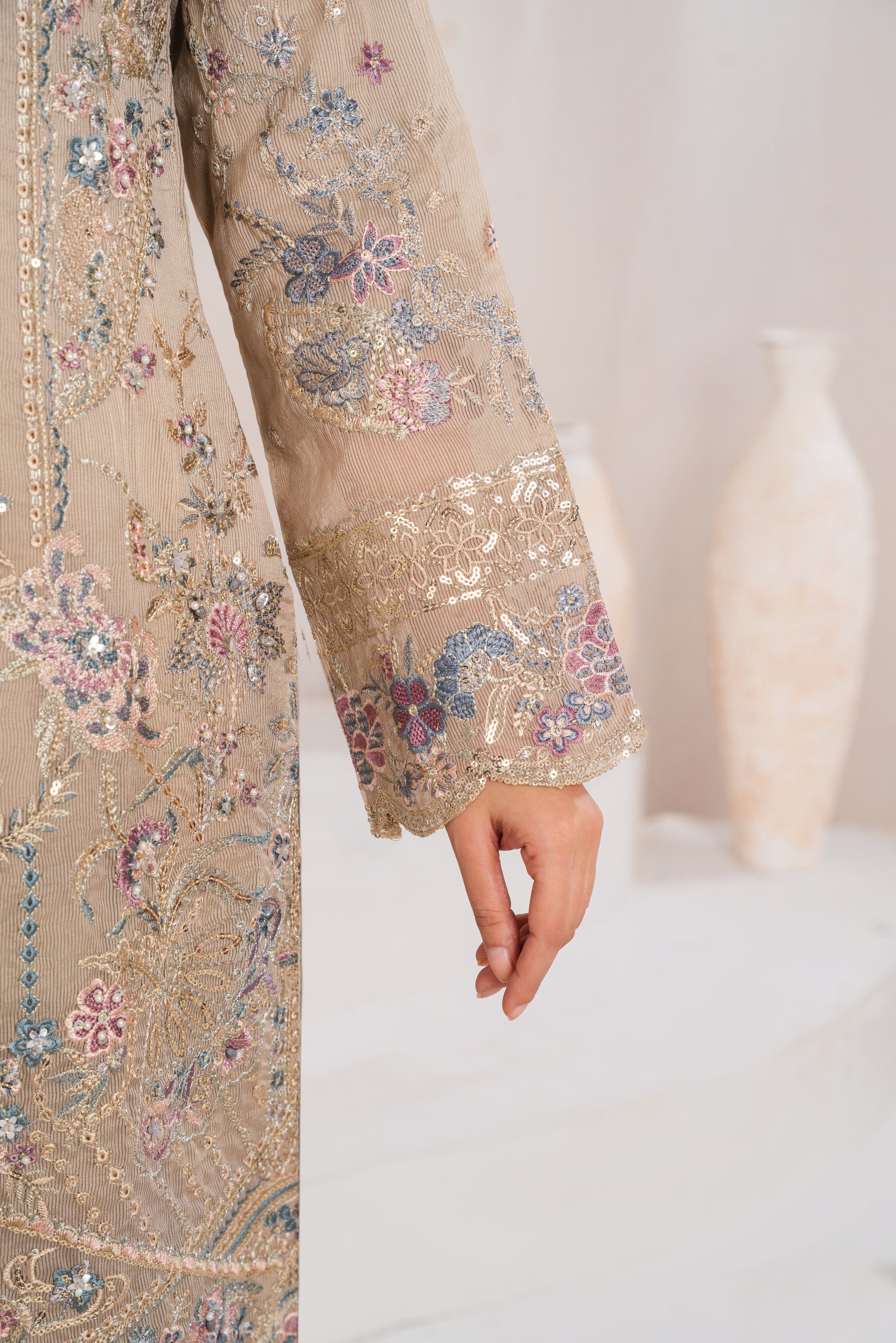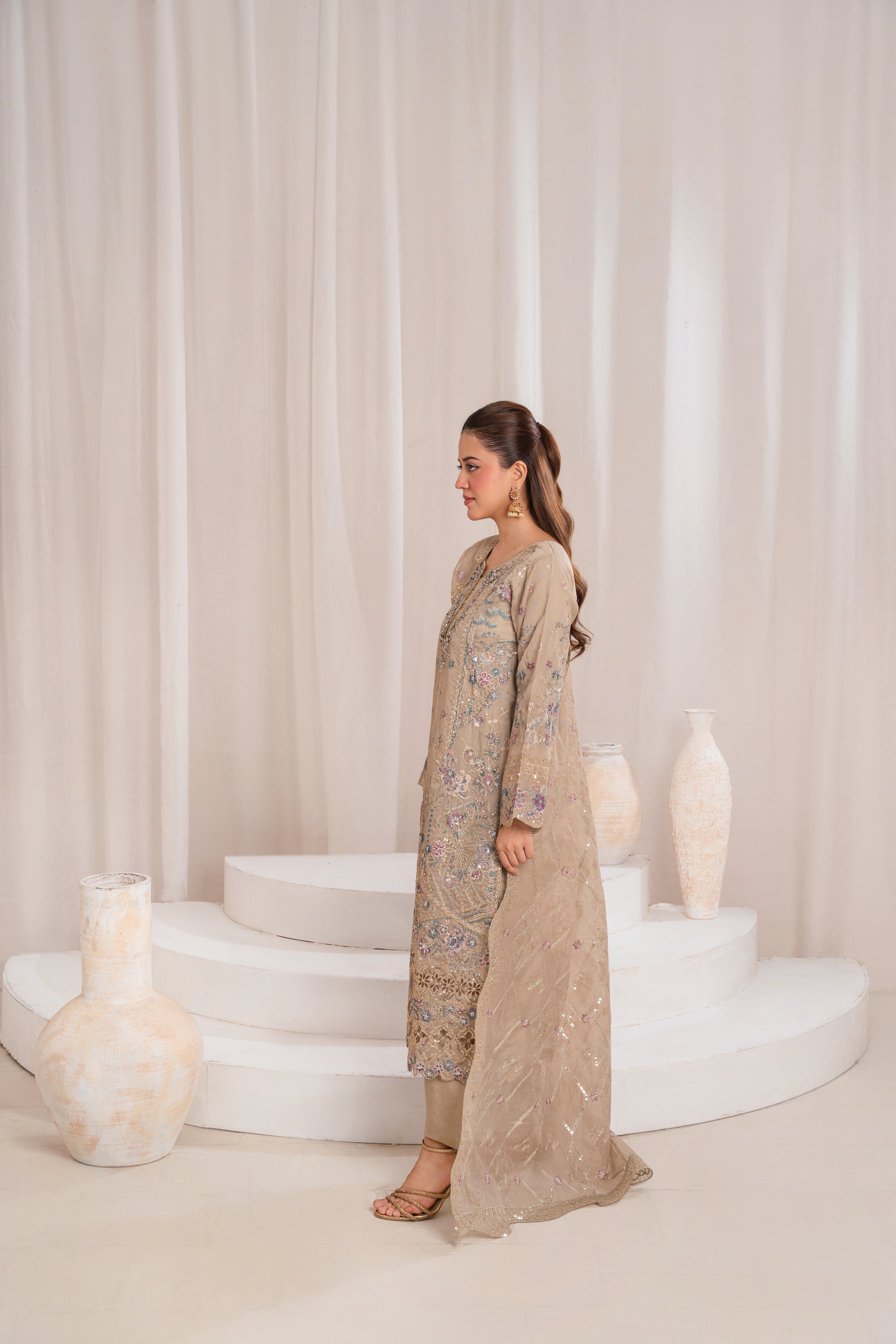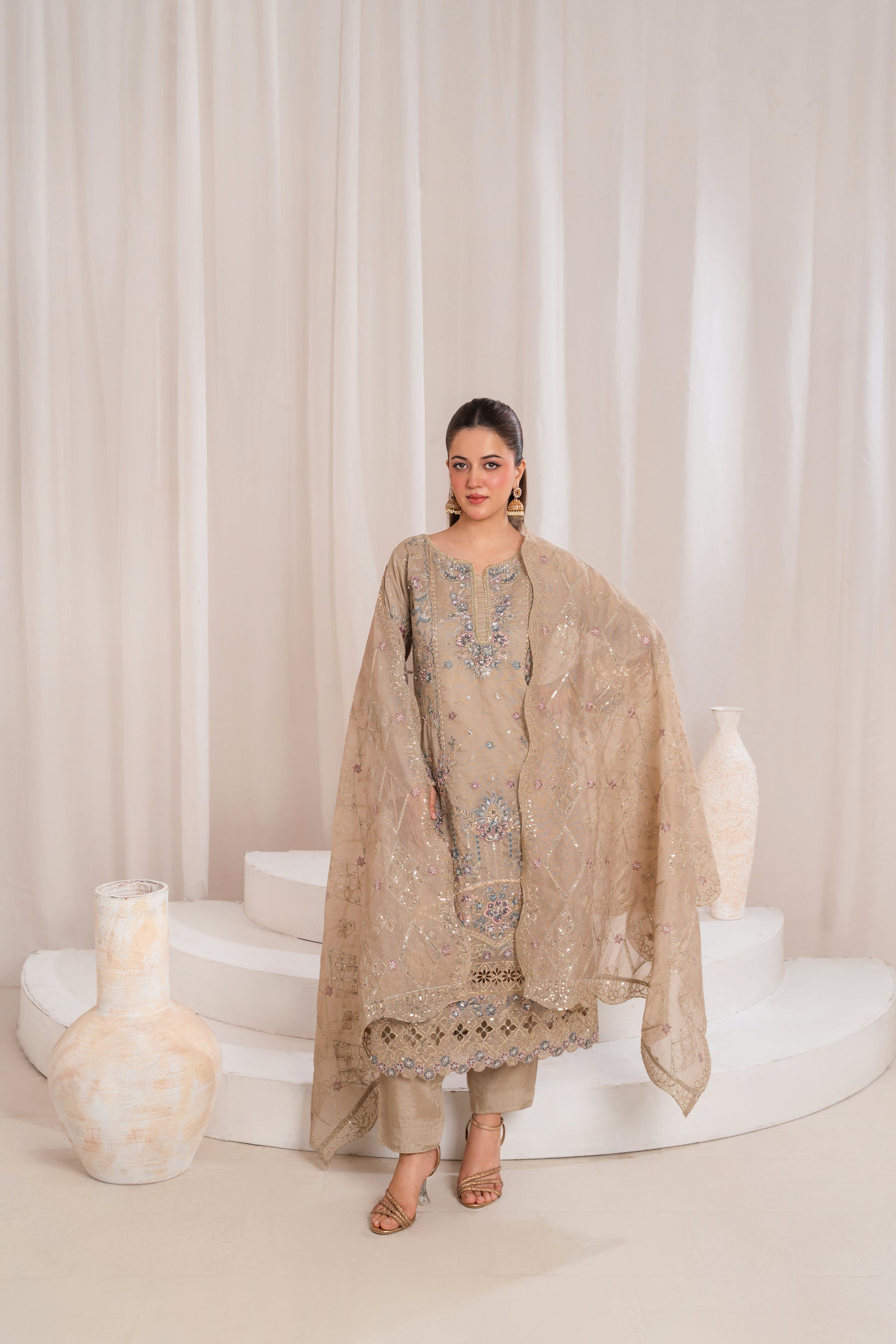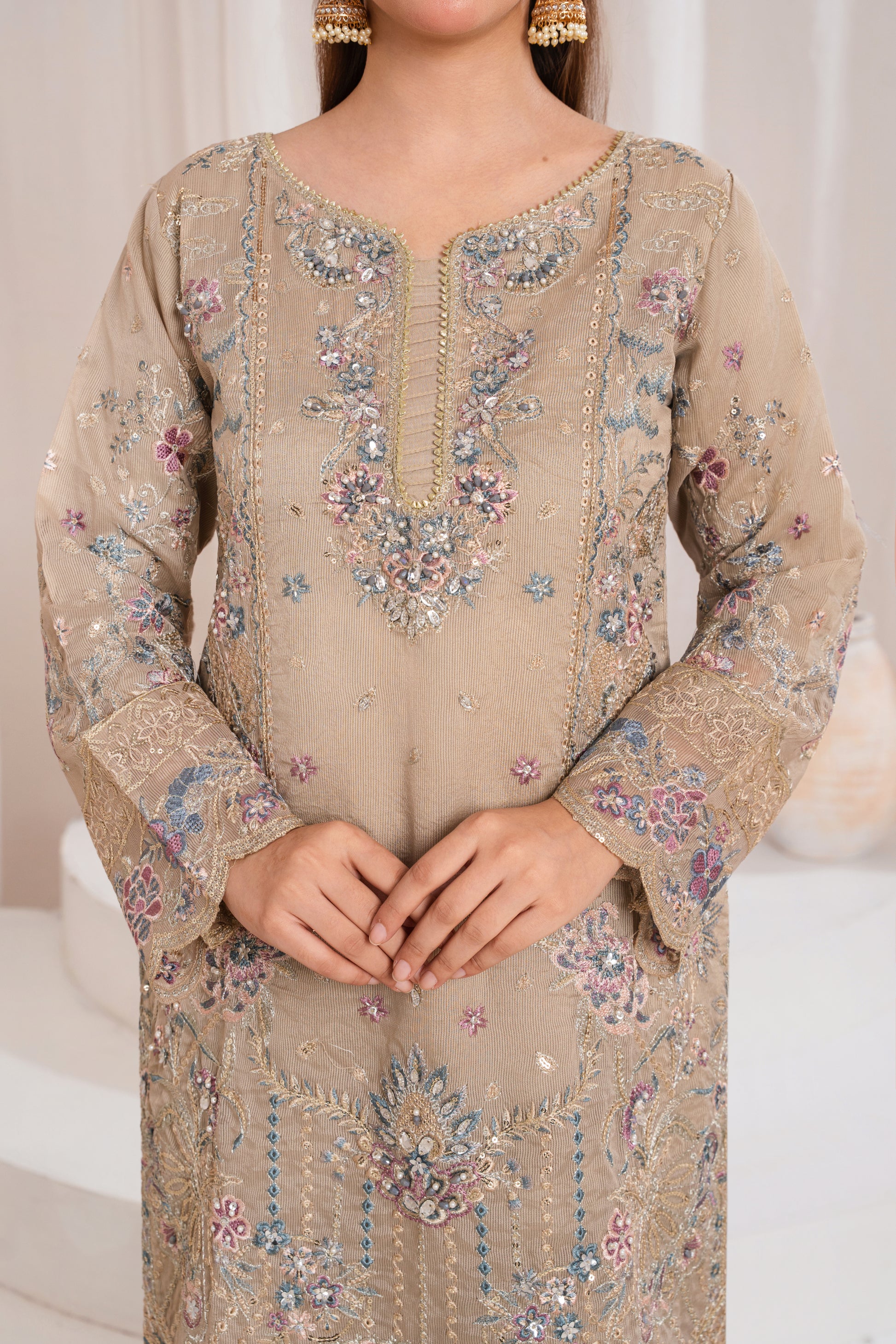 Elegant beige embroidered outfit featuring a Khaadi net shirt and Khaadi net dupatta, paired with a Russian grip trouser β€” perfect for festive and formal occasions.