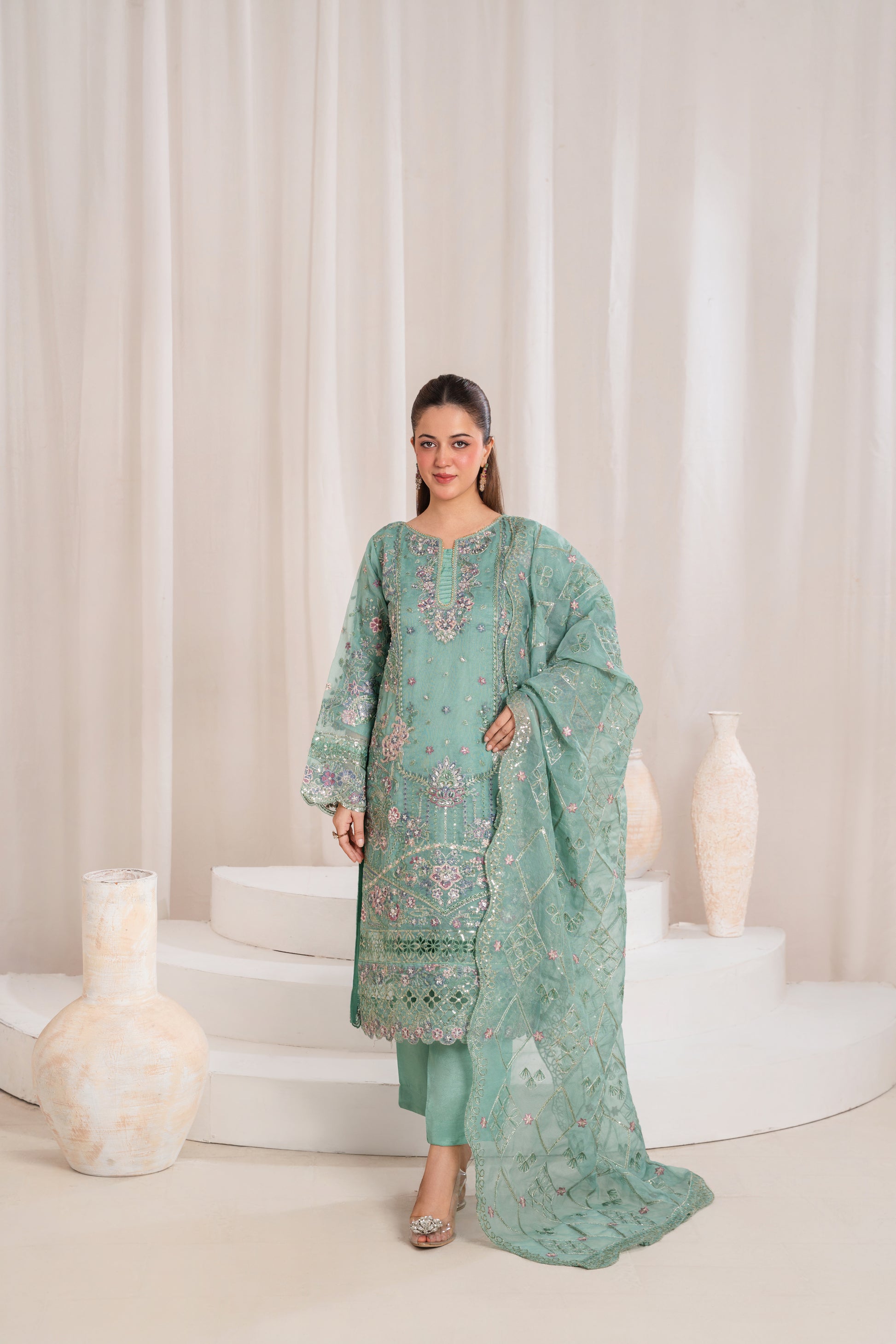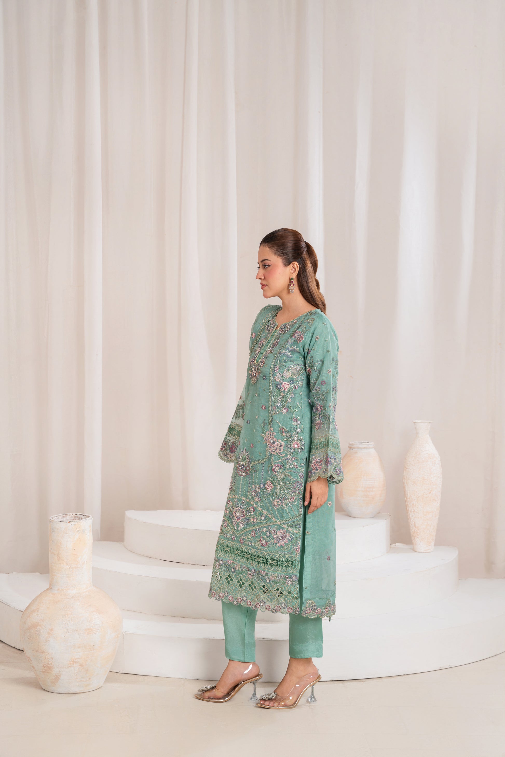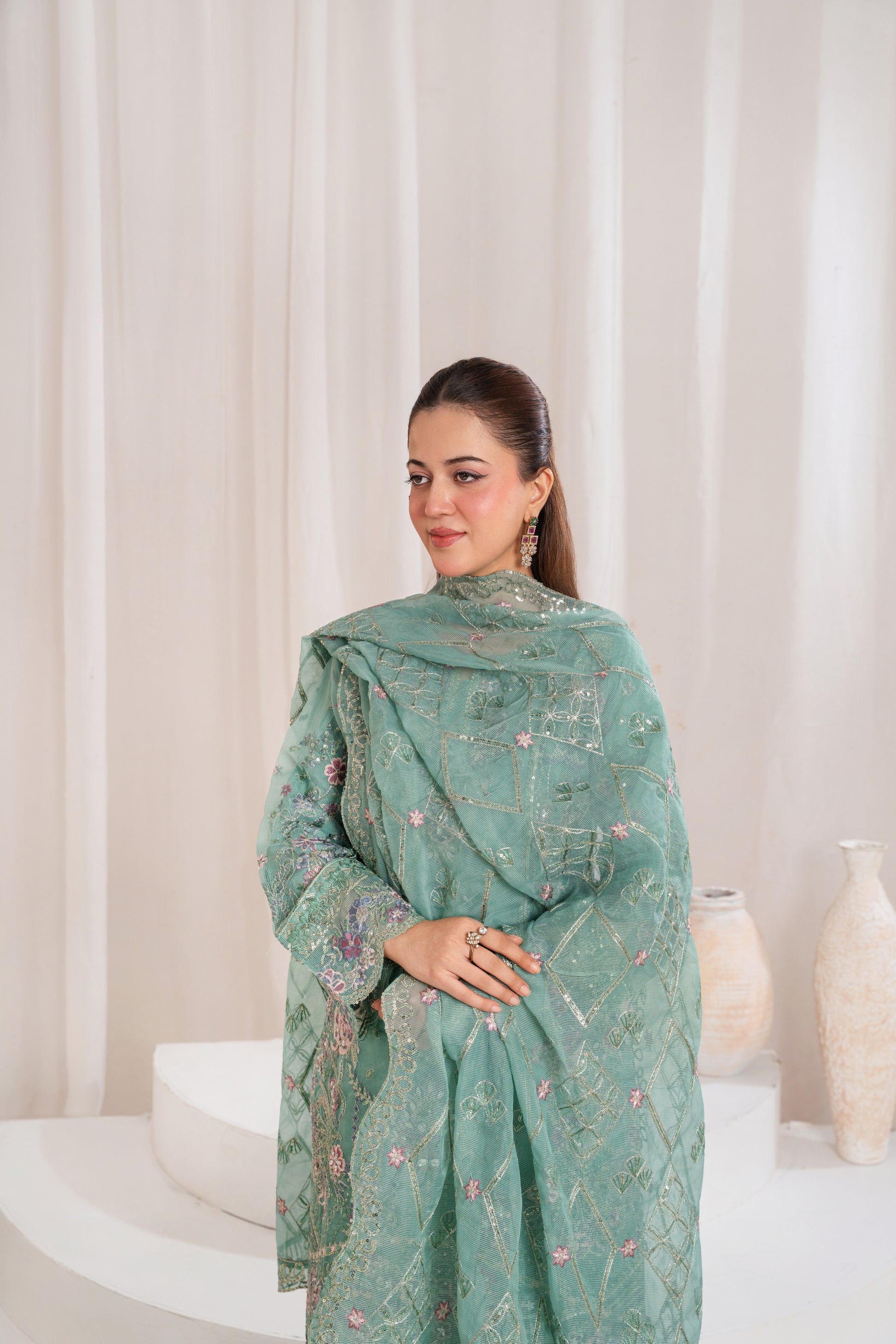 Graceful mint green embroidered outfit featuring an organza shirt and organza dupatta, paired with a Russian grip trouser β€” perfect for festive and formal wear.