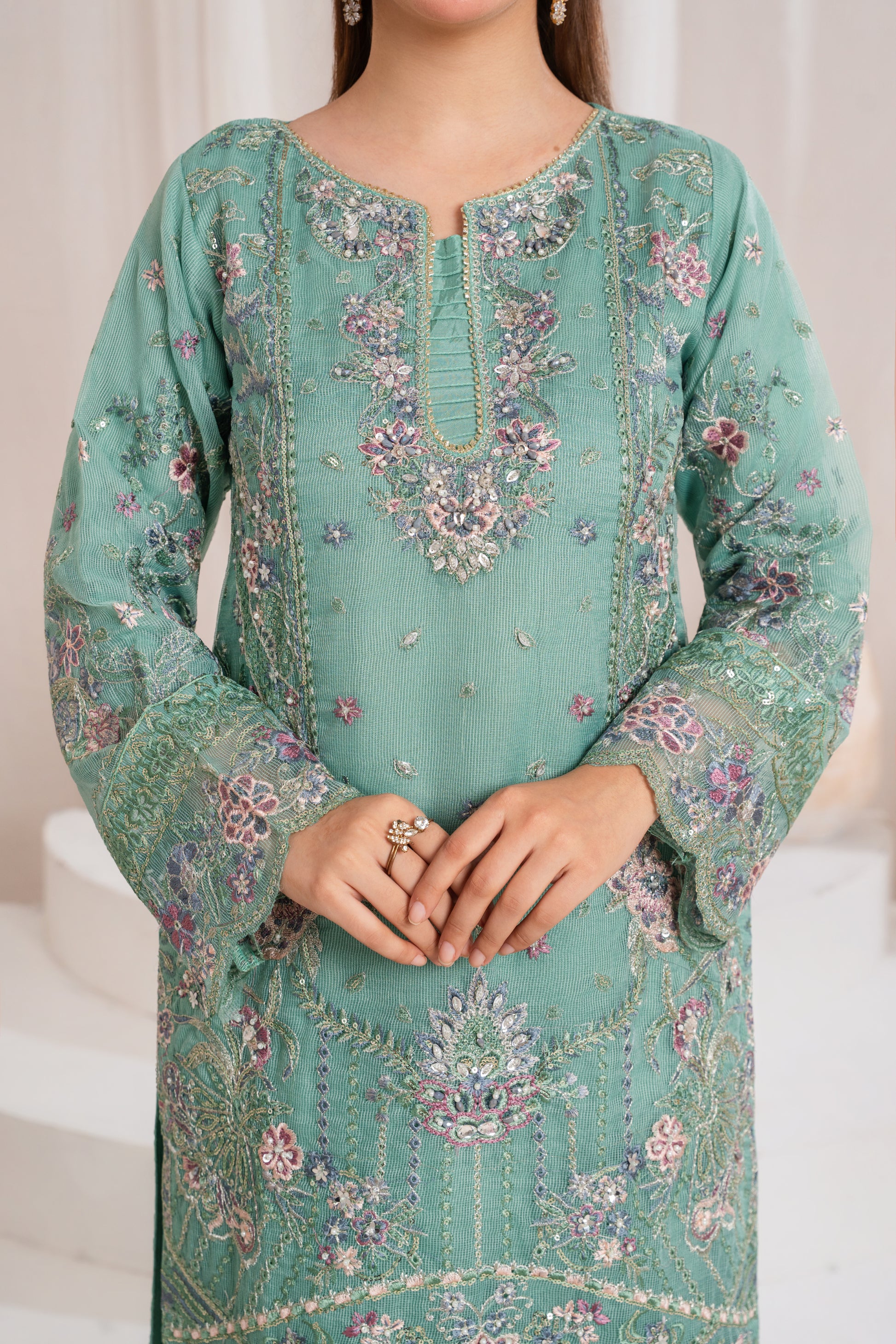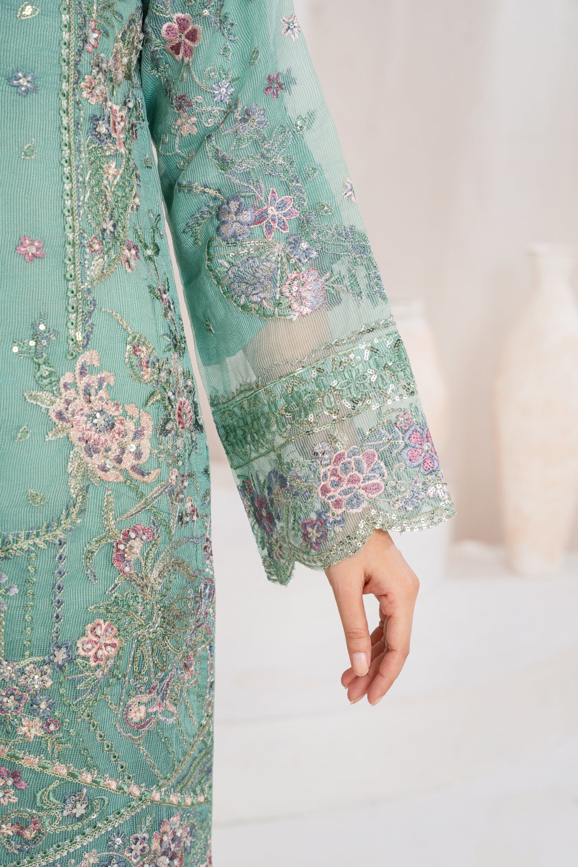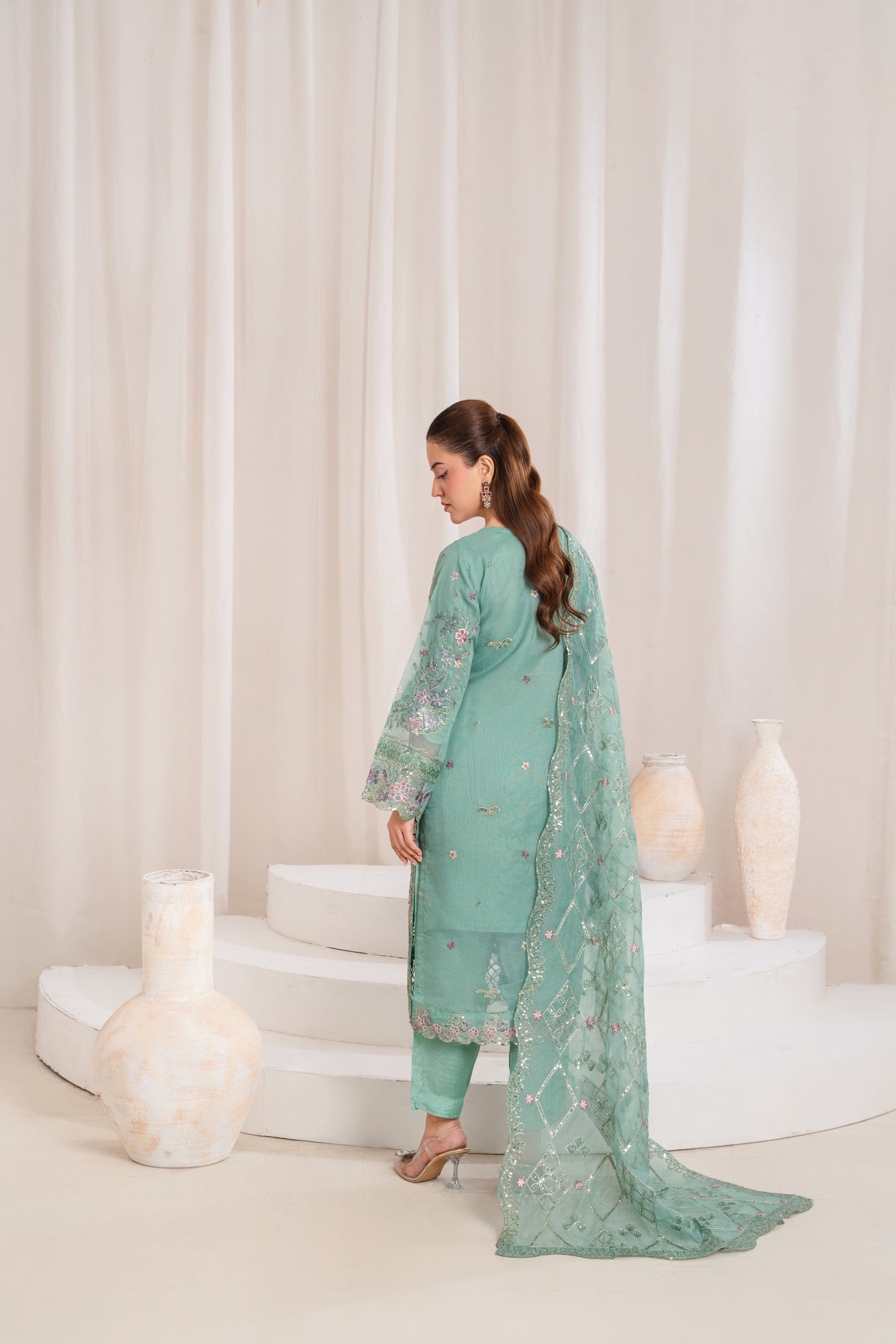 Graceful mint green embroidered outfit featuring an organza shirt and organza dupatta, paired with a Russian grip trouser β€” perfect for festive and formal wear.