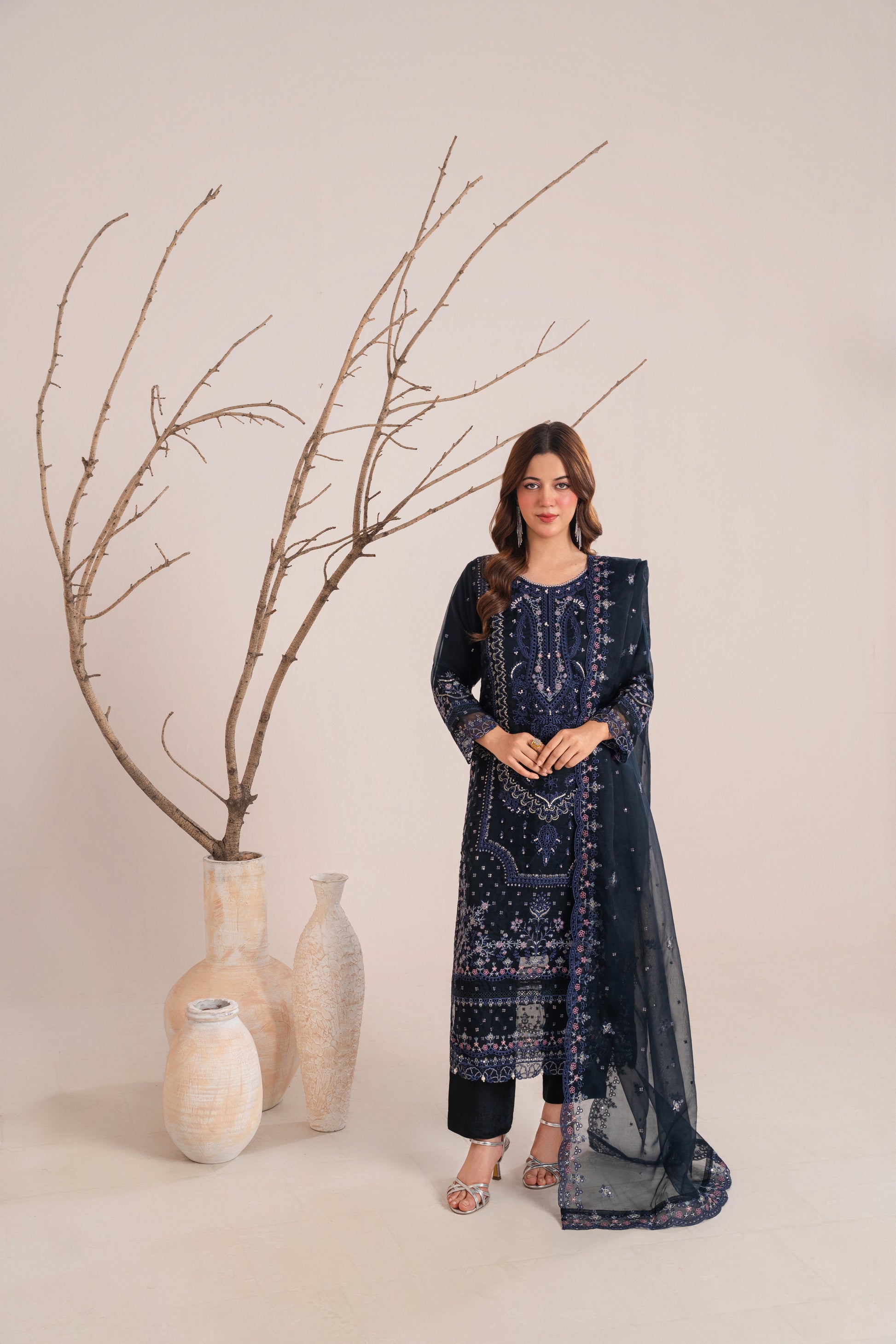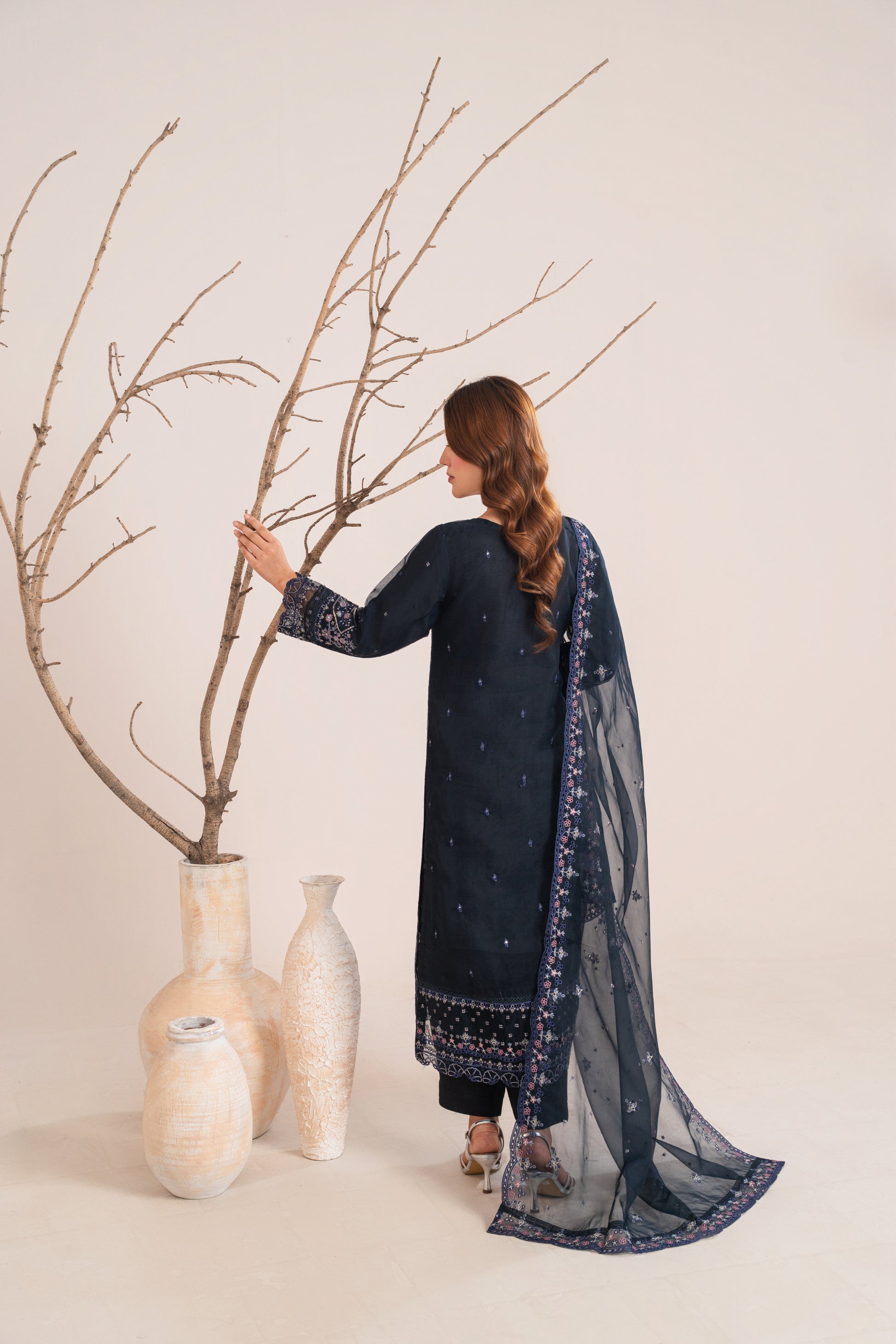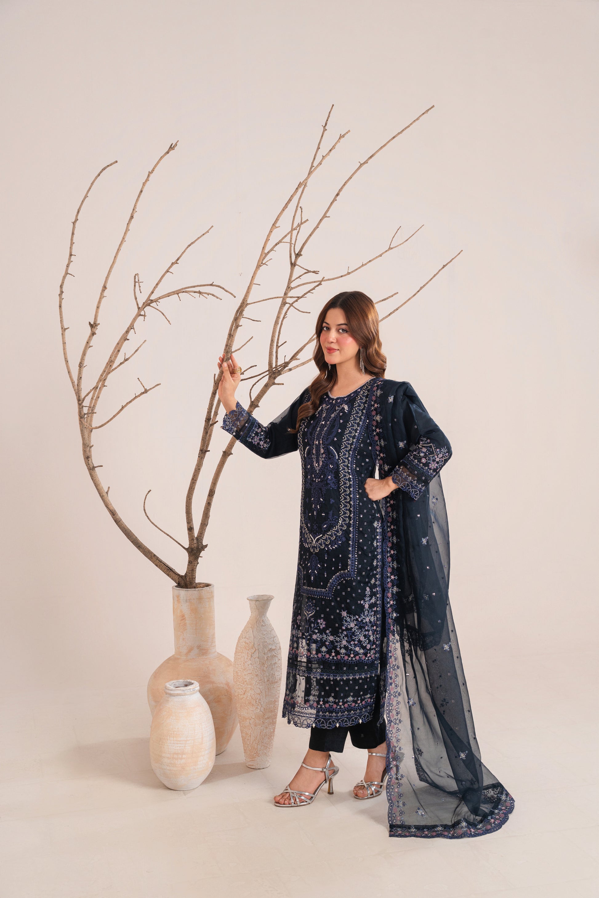 Graceful navy blue embroidered outfit with intricate floral details, perfect for festive and formal occasions.