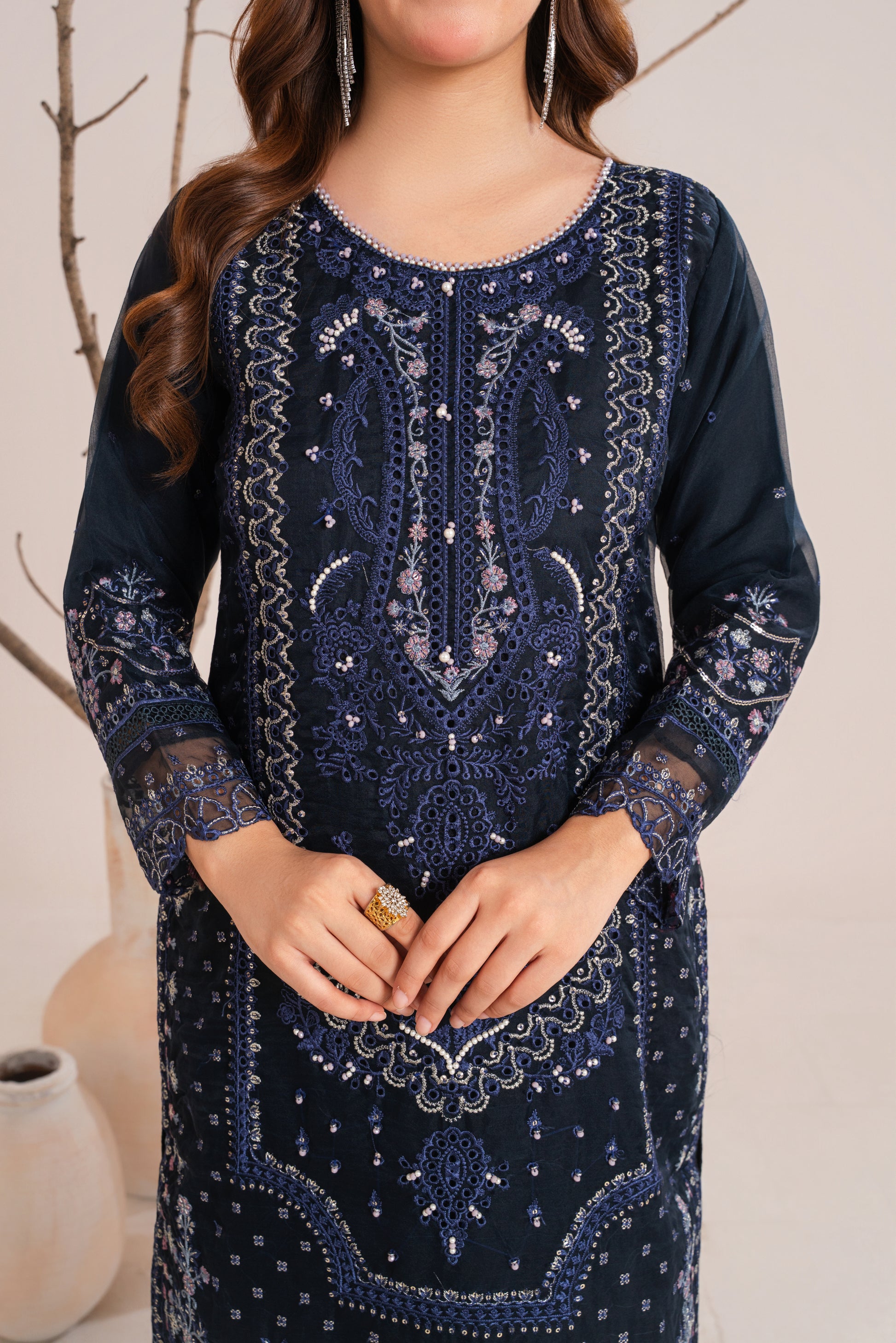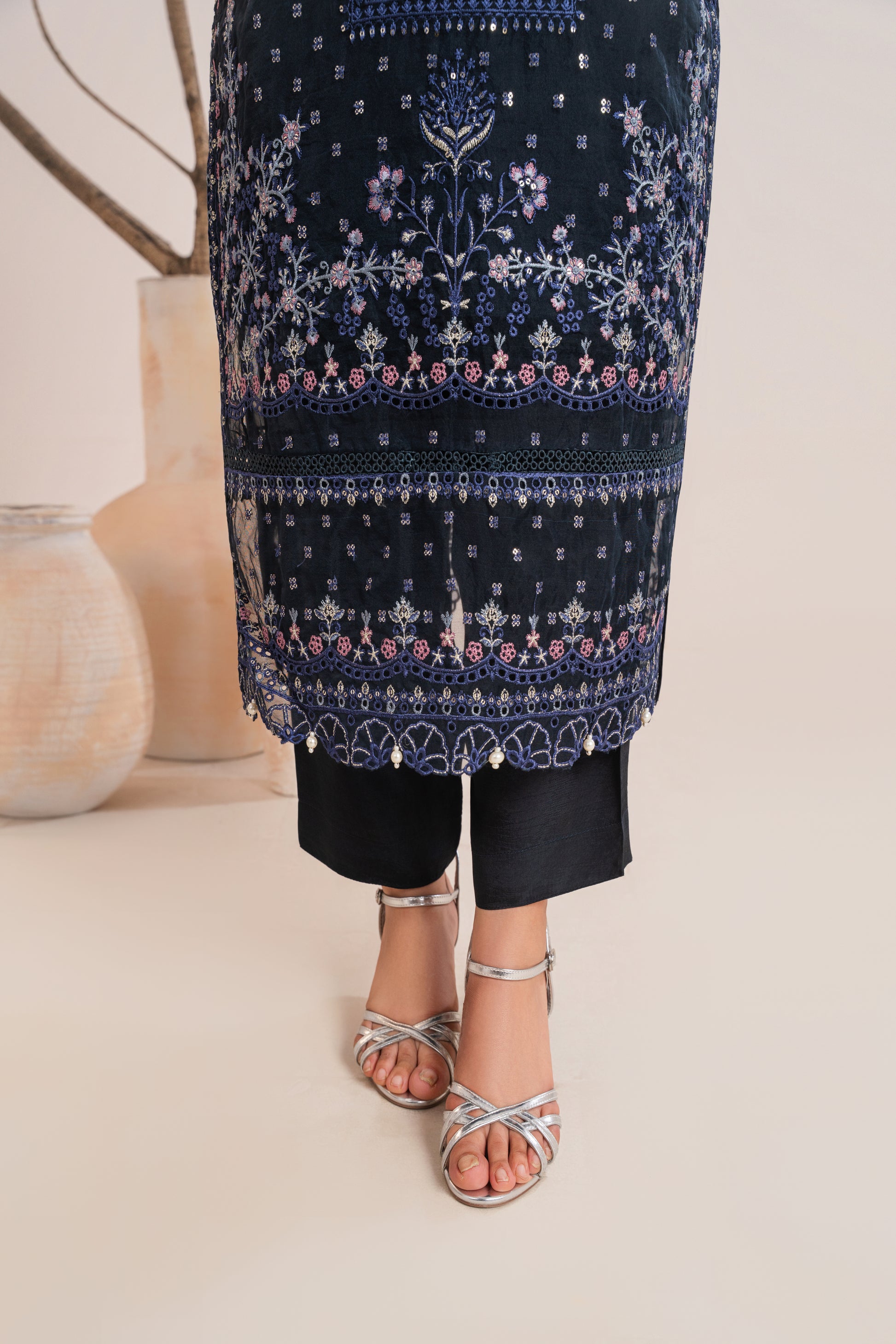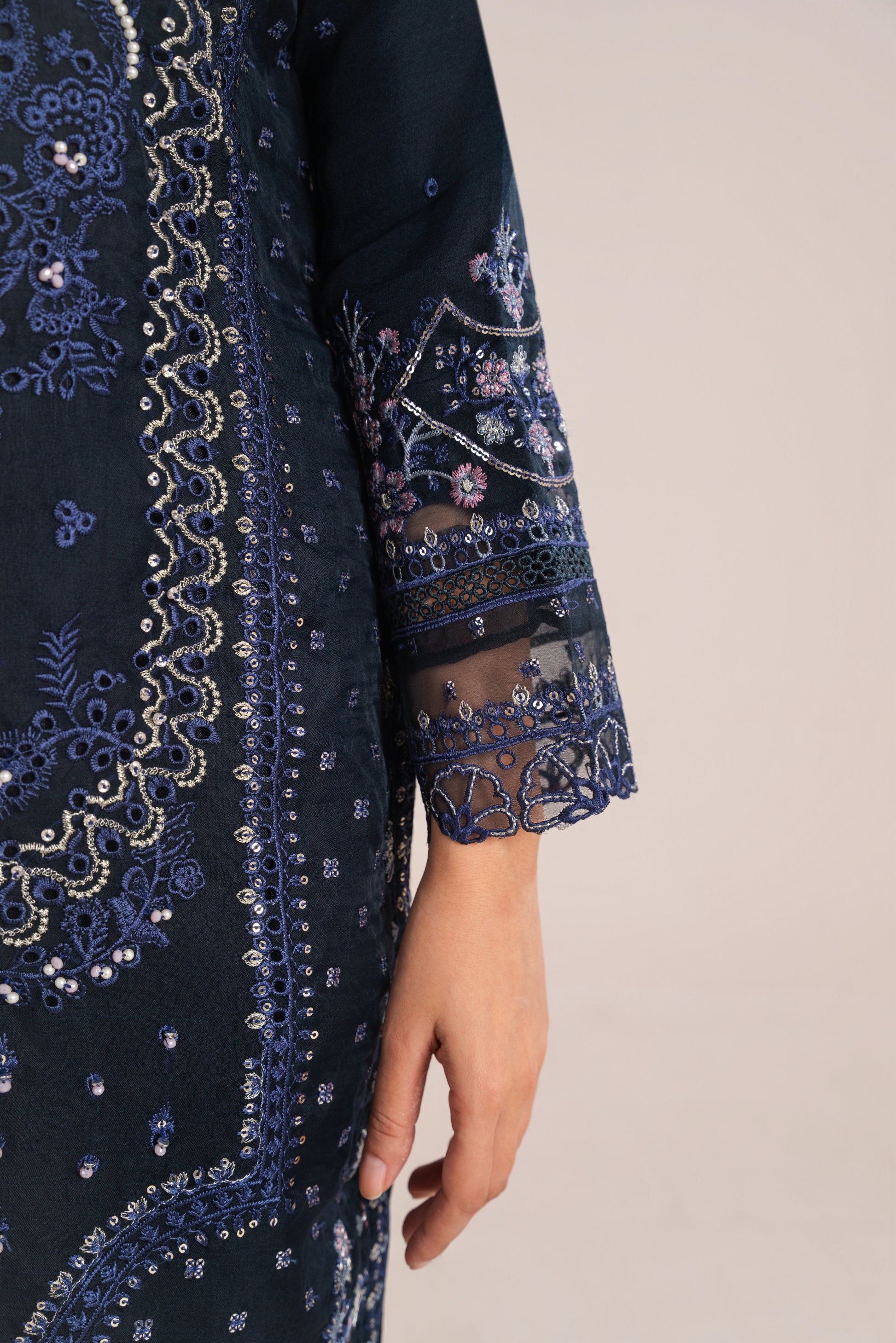 Graceful navy blue embroidered outfit with intricate floral details, perfect for festive and formal occasions.