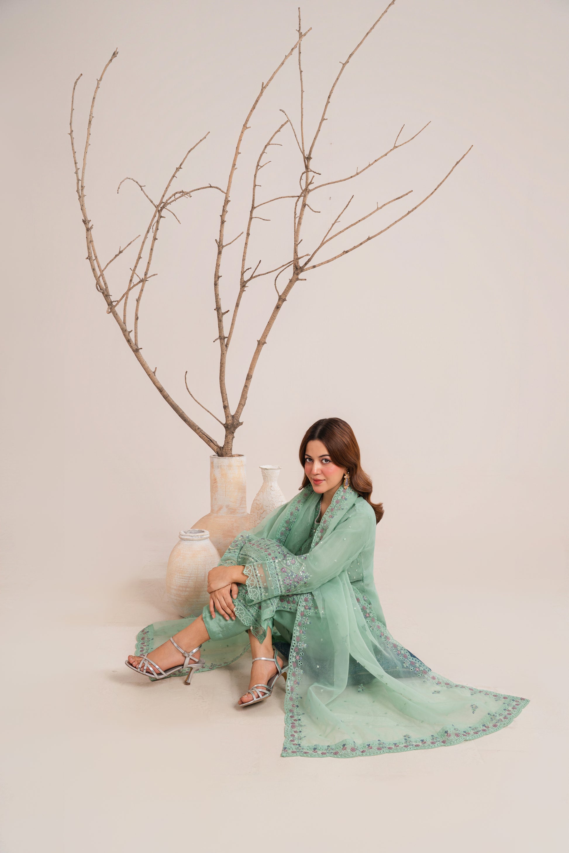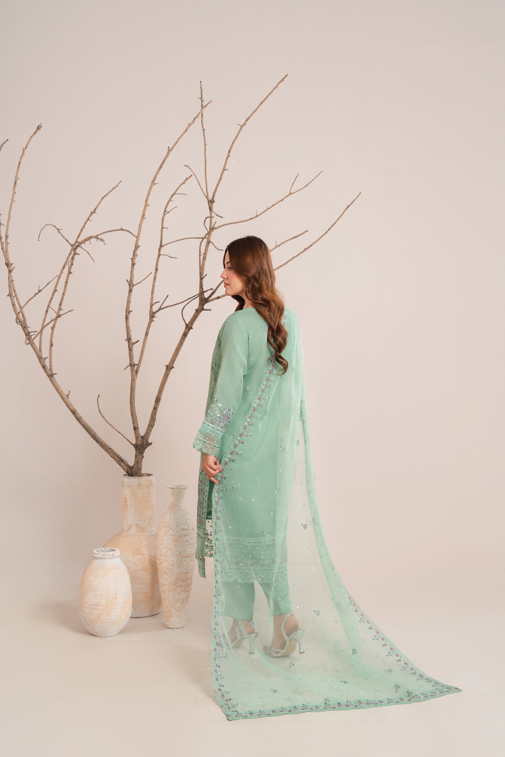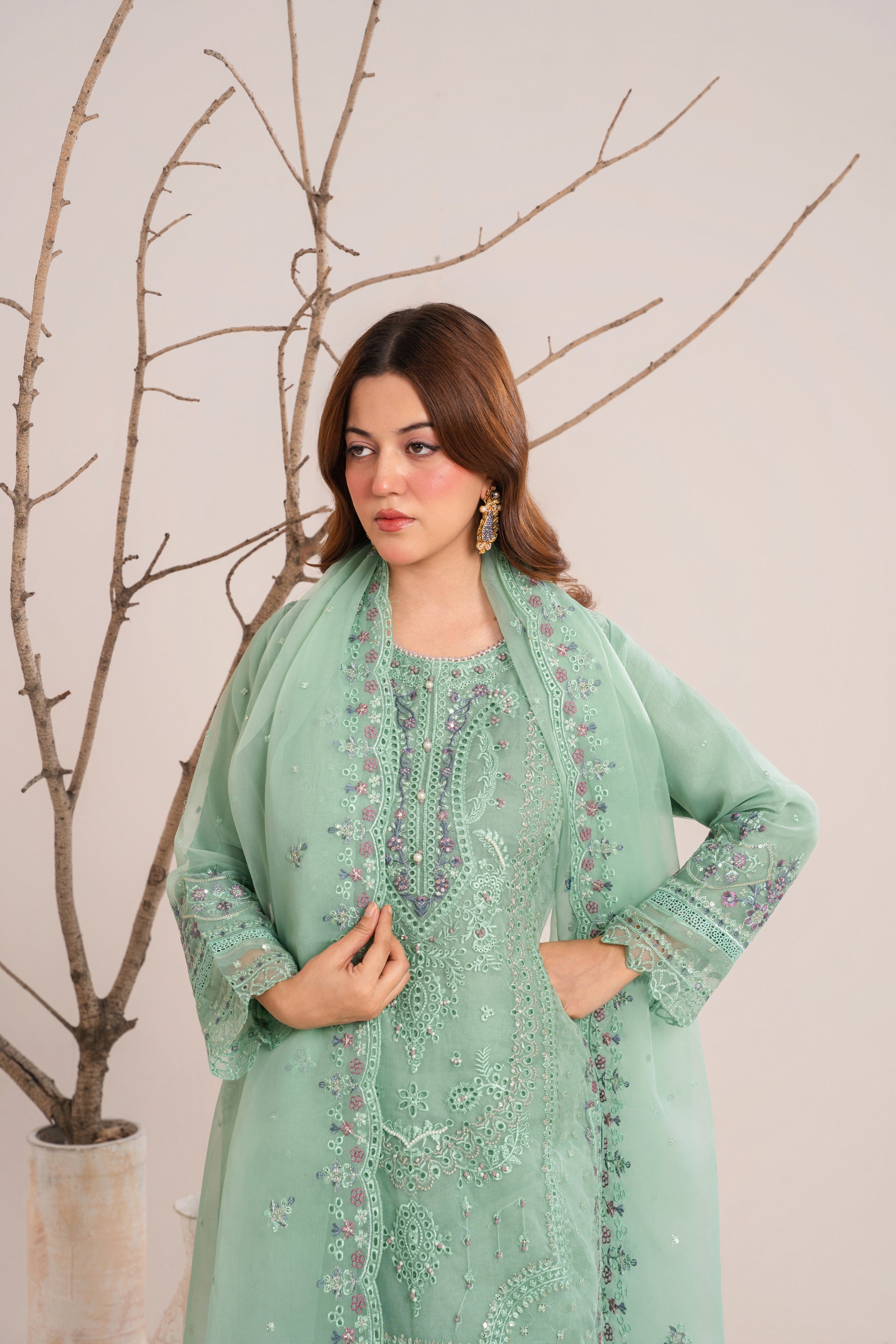Graceful mint green embroidered outfit with delicate detailing, perfect for festive and semi-formal occasions.