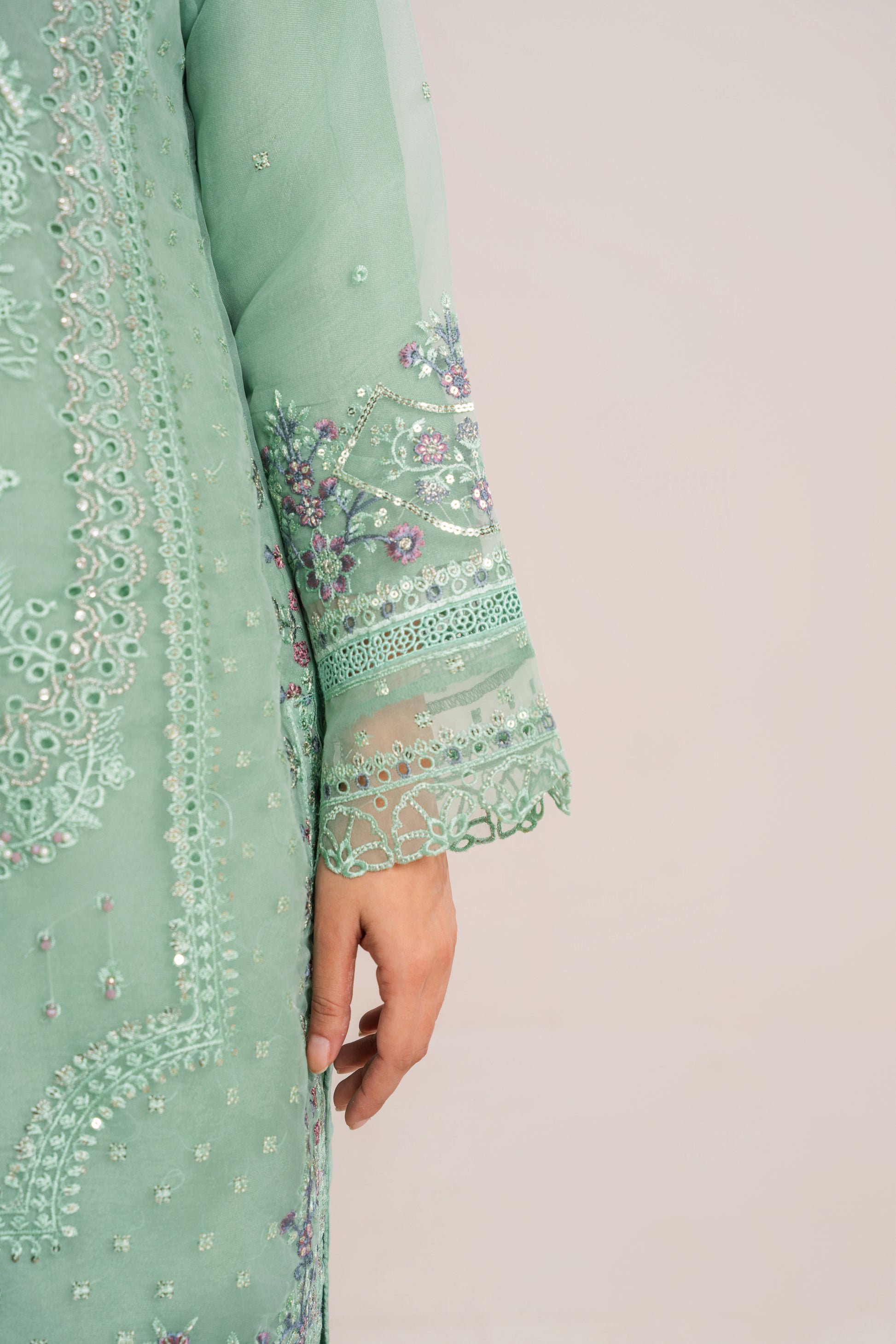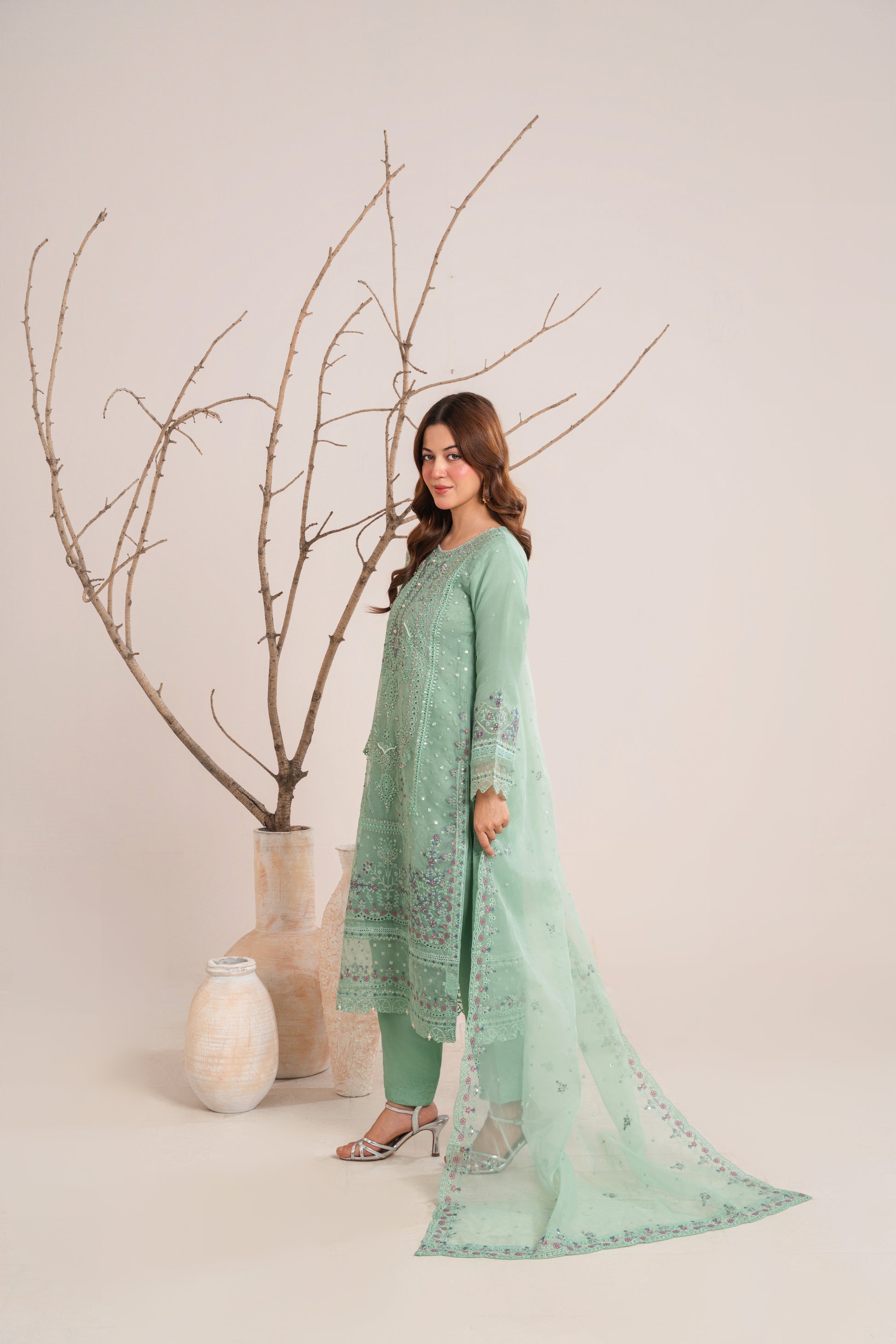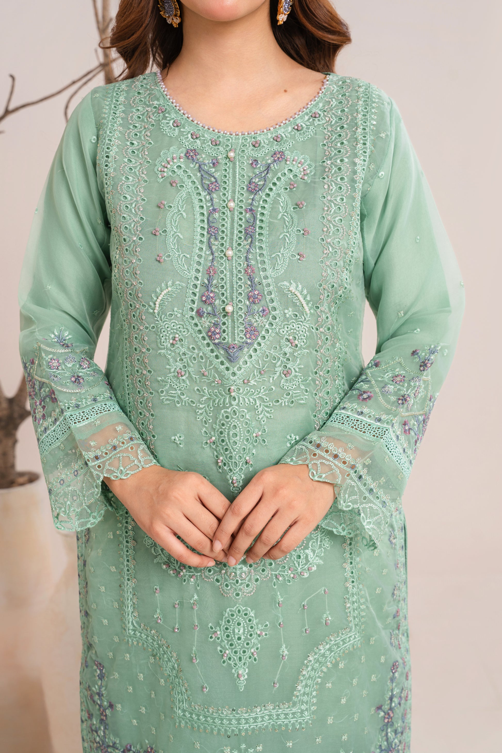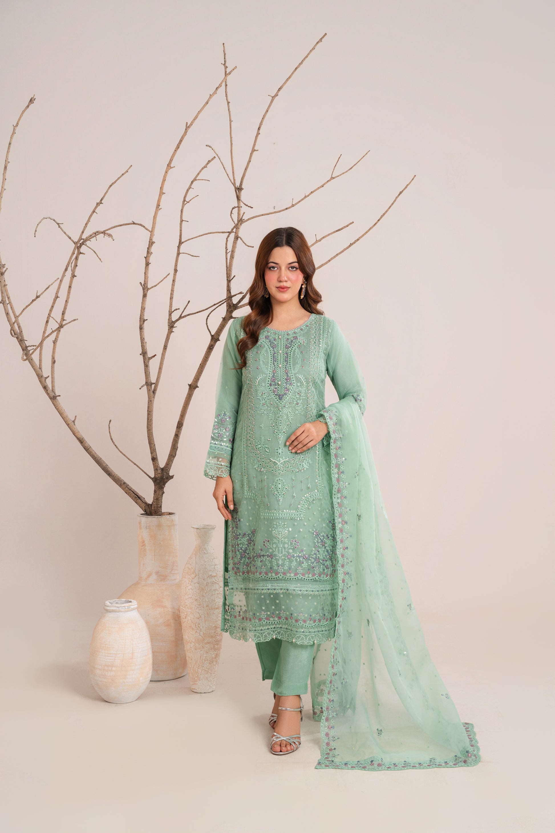 Graceful mint green embroidered outfit with delicate detailing, perfect for festive and semi-formal occasions.